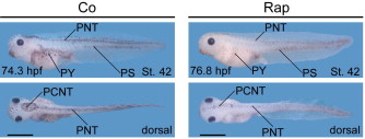 Pigmentation defects induced by rapamycin treatment. Major pigmentation located at lateral and dorsal side of embryos at stage 42 was obviously detected in control embryos, but weakly in rapamycin-treated (20 μM) embryos (100%, n = 15). PCNT, PNT, PY, and PS indicate pigmentation underlain by cephalic neural tube, neural tube, yolk, and somites. Slightly bigger yolk was frequently observed in treated. Scale bars represent 1 mm.