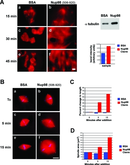 During mitosis, the nuclear pore complex is disassembled and, increasingly, nucleoporins are proving to have mitotic functions when released from the pore. We find a contribution of the nucleoporin Nup98 to mitotic spindle assembly through regulation of microtubule dynamics. When added to Xenopus extract spindle assembly assays, the C-terminal domain of Nup98 stimulates uncontrolled growth of microtubules. Conversely, inhibition or depletion of Nup98 leads to formation of stable monopolar spindles. Spindle bipolarity is restored by addition of purified, recombinant Nup98 C-terminus. The minimal required region of Nup98 corresponds to a portion of the C-terminal domain lacking a previously characterized function. We show association between this region of the C-terminus of Nup98 and both Taxol-stabilized microtubules and the microtubule-depolymerizing mitotic centromere-associated kinesin (MCAK). Importantly, we demonstrate that this domain of Nup98 inhibits MCAK depolymerization activity in vitro. These data support a model in which Nup98 interacts with microtubules and antagonizes MCAK activity, thus promoting bipolar spindle assembly.