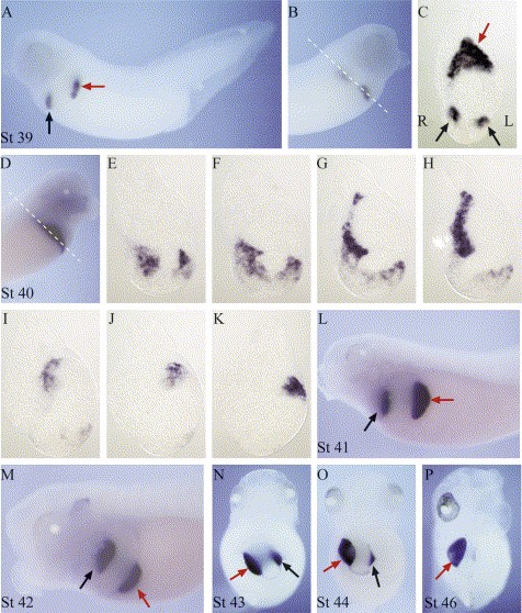 Fig. 2. Expression of XPDIp in Xenopus embryos between stages 39 to 46. (A) A left side view with expression of XPDIp in the dorsal (red arrow) and ventral (black arrow) pancreatic buds. Note the posterior position of the dorsal bud relative to the ventral bud. (B) A right side view of the same embryo as shown in panel A; note the proximity of the dorsal and ventral pancreatic buds on this side of the embryo. The dim appearance of the dorsal bud in right side view as compared to the left side view is as a result of a slight shift of the dorsal bud to the left of the embryo. (C) A cross-section of a stage 39 embryo (at the level indicated by dotted lines in panel B) showing the dorsal pancreatic bud (red arrow) and the two ventral buds (black arrows) not yet fused at this stage. Note the slight ventral expansion of the dorsal bud on the right side, and the corresponding dorsal shift of the rightventral bud. R and L indicate the right and left side of the embryo, respectively. (D) A right side view showing the fused dorsal and ventral pancreatic buds in a stage 40 embryo. (EâK) Serial sections from anterior to posterior of the embryo shown in panel D. Note the fusion of the two ventral buds in panel F. Inspection of panel G reveals that a part of the right half of the dorsal pancreas is fused to the rightventralpancreas. Panel H illustrates the dorsal bud in the medial position of the embryo as it extends from the right to the left half; the left half of the dorsal bud is not visible in G and H because it is positioned more posteriorly. Panel I-K reveal the left half of the dorsal pancreas, which lies posterior to the right half. (LâP) Expression of XPDIp in embryos between stages 41 to 46. L, M are leftlateral views; N, O are antero-ventral views and P a right-ventral view. The dorsally derived pancreas is indicated with a red arrow and the ventrally derived pancreas with a black arrow.