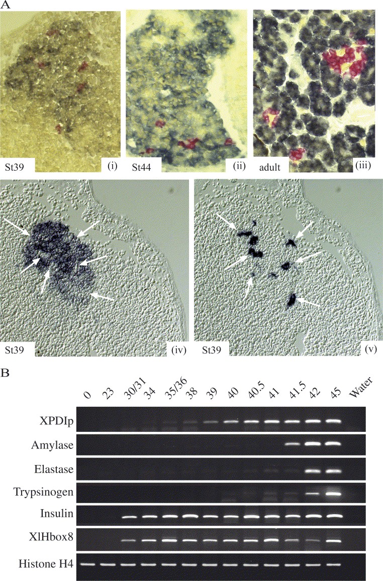 Fig. 3. A comparative expression analysis of XPDIp and other pancreas specific genes. (A) In situ hybridization showing xPDIp and insulin expressing cells in embryonic and adult pancreas. (i)â(iii) Double in situ hybridization staining of insulin (red) and XPDIp (blue) expressing cells in the adult and embryonic pancreas. XPDIp/insulin co-staining of stage 39 dorsal embryonic pancreas, stage 44 embryonic pancreas as well as the adult Xenpouspancreas shows that expression of XPDIp is largely restricted to the exocrine pancreatic lineage. (iv) and (v) show the expression of XPDIp and insulin respectively on neighbouring section of stage 39 embryo. The two sections are 5 μm apart, with (iv) anterior to (v). The arrows indicate groups of cells, which express insulin (v) and the corresponding exclusion of XPDIp expression in such cells (iv). (B) Comparison of the temporal expression patterns of XPDIp, amylase, elastase, trypsinogen, insulin and XlHbox8 by RT-PCR.