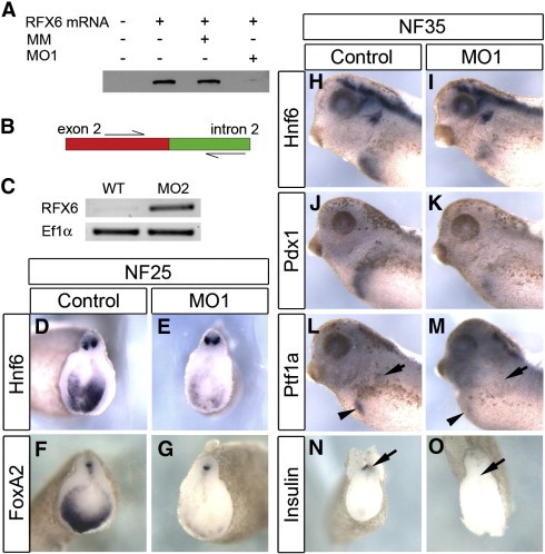 Fig. 2. Rfx6 LOF leads to decreased expression of foregut and pancreas markers early in pancreas development. (A) Western blot with anti-flag antibody of in vitro TnT assay of translation. This demonstrates that MO1 prevents translation of rfx6 mRNA, while the mis-match morpholino (MM) does not. Rfx6 mRNA, flag-tagged rfx6 mRNA plasmid; MM, mis-match morpholino. (B) Diagramatic representation of RT-PCR test of MO2 efficiency. (C) RT-PCR performed on wild-type (WT) and MO2-injected tadpoles. WT mRNA is processed leaving the reverse primer unable to bind resulting in no amplification in the Rfx6 panel. MO2 blocks mRNA processing at the intron 2 donor site (5' end of the intron) as demonstrated by the presence of PCR product in MO2 lane. Ef1α is a housekeeping gene used as a loading control. (D, E) Hnf6 expression is reduced in the morphant foregut endoderm at NF25 (24/28 reduced). (F, G) FoxA2 expression is reduced in the morphant foregut endoderm at NF25 (17/28). (H, I) Hnf6 expression is reduced in the morphant foregut at NF35 (10/13 reduced). (J, K) Pdx1 expression is reduced in the morphant (17/19 reduced). (L, M) Ptf1a expression is reduced in both the dorsal (arrow) and ventral (arrowhead) pancreatic buds of the morphant (n = 18). (N, O) Early insulin expression in the dorsal pancreatic bud (arrow) is lost in morphant tissue (56/62 reduced). Control tadpoles were injected with 25 ng mis-match morpholino. |