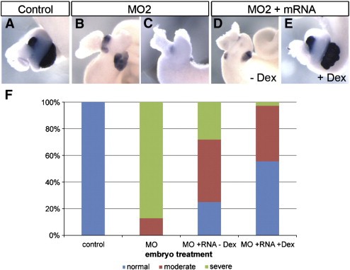 Fig. 4. Rfx6 mRNA rescues the morpholino knockdown phenotype. (A) Control whole gut stained for elastase expression (n = 9). (B, C) Whole guts from embryos injected with 40 ng MO2, elastase expression is reduced (n = 47, 6 moderate, 41 severe). (B) Moderate MO2 phenotype, (C) Severe MO2 phenotype. (D) Whole gut from embryo injected with 40 ng MO2 and 100 pg rfx6-GR mRNA. No dexamethosone was added. Elastase expression is reduced (n = 32, 8 normal, 15 moderate, 9 severe). (E) Whole gut from embryo injected with 40 ng MO2 and 100 pg rfx6-GR mRNA. 2 μg/mL dexamethosone was added at NF25 to activate Rfx6-GR protein. Elastase expression is restored (n = 36, 20 normal, 15 moderate, 1 severe). (F) Rescue results from all experimental whole guts. Severe phenotype refers to complete absence of elastase expression and gut malformation; moderate phenotype refers to reduced elastase expression and some gut malformation; normal refers to whole guts with normal levels of elastase expression and normal overall gut morphology. |