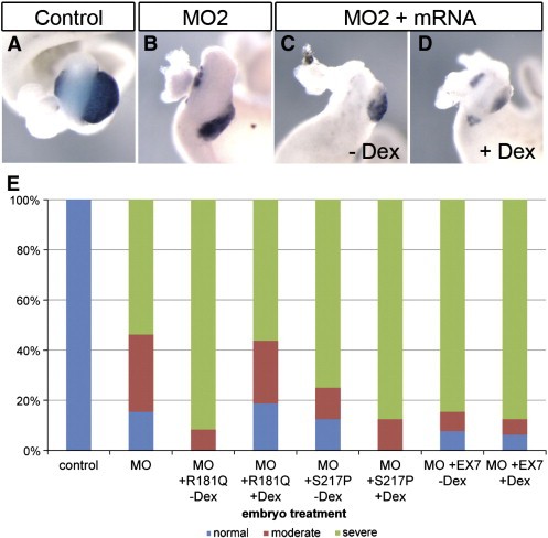 Fig. 5. Mutant rfx6 mRNA cannot rescue the morpholino knockdown phenotype. (A) Control whole gut stained for elastase expression (n = 17). (B) Whole gut from embryo injected with 40 ng MO2, elastase expression is reduced (n = 26, 4 normal, 8 moderate, 14 severe). (C) Whole gut from embryo injected with 40 ng MO2 and 100 pg rfx6R181Q-GR mRNA. No dexamethosone was added. Elastase expression is reduced (n = 12, 1 moderate, 11 severe). (D) Whole gut from embryo injected with 40 ng MO2 and 100 pg rfx6R181Q-GR mRNA. 2 μg/mL dexamethosone was added at NF25 to activate Rfx6R181Q-GR protein. Elastase expression remains reduced (n = 16, 3 normal, 4 moderate, 9 severe). (E) Rescue results for three rfx6 mutants: R181Q, S217P, and EX7 (Rfx6 is truncated after exon 7). Severe phenotype refers to complete absence of elastase expression and gut malformation; moderate phenotype refers to reduced elastase expression and some gut malformation; normal refers to whole guts with normal levels of elastase expression and normal overall gut morphology. S217P âdex n = 16, 2 normal, 2 moderate, 14 severe. S217P + dex n = 16, 2 moderate, 14 severe. EX7 âdex n = 13, 1 normal, 1 moderate, 11 severe. EX7 + dex n = 16, 1 normal, 1 moderate, 14 severe. |