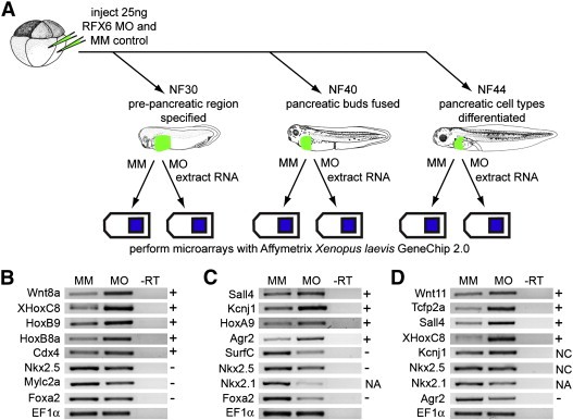 Fig. 6. LOF microarray experiment schematic and RT-PCR verification of selected genes. (A) Schematic diagram of LOF microarray experiment. Eight-cell stage embryos were injected with 25 ng of either Rfx6 start site morpholino (MO) or mis-match control (MM). Samples were collected at NF30, NF40 and NF44, RNA was extracted and hybridized to Affymetrix Xenopus laevis GeneChip 2.0. (BâD) RT-PCR verification of selected differentially expressed genes from the LOF microarray analysis. (B) NF30. (C) NF40. (D) NF44. +, microarray experiment showed upregulation; â, microarray experiment showed downregulation, NA, this probe was not on the microarray but was shown to be downregulated in in situ experiments, NC, the microarray experiment detected no change. Differential expression in RT-PCR findings are consistent with results seen in the microarray experiment. MM, mis-match control; MO, MO1; -RT, control reaction without reverse transcriptase. |