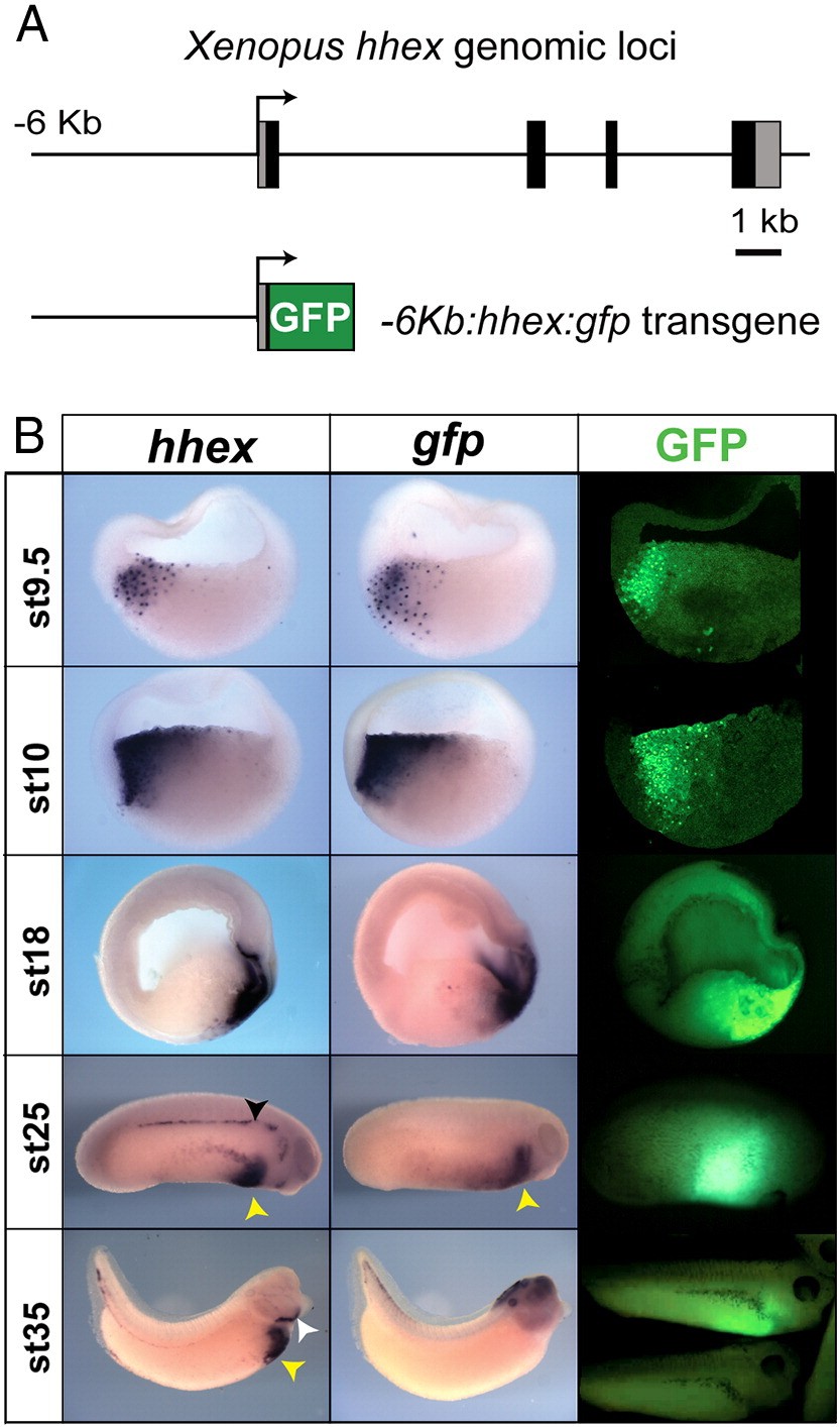 Fig. 1. A â6Kb:hhex:gfp transgene recapitulates hhex expression. (A) Diagram of the Xenopus laevis hhex genomic locus and â6.0Kb:hhex:gfp transgene. (B) The transgene recapitulates hhex expression in the anterior endoderm from blastula (st9.5) to stages 25. Transgenic embryos assayed by in situ hybridization for hhex or gfp mRNA and for GFP fluorescence with a confocal (st9.5 and 10) or stereomicroscope (st18â35). Embryos from st9.5 to 18 are bisected; in st9.5â11, dorsal is left; and in st18â35, anterior is right. The GFP image at st35 shows both a transgenic (top) and non-transgenic embryos (bottom). Two independent transgenic lines exhibited identical expression patterns. Arrowheads indicate endothelial cells (black), thyroid (white), and liver bud (yellow). |