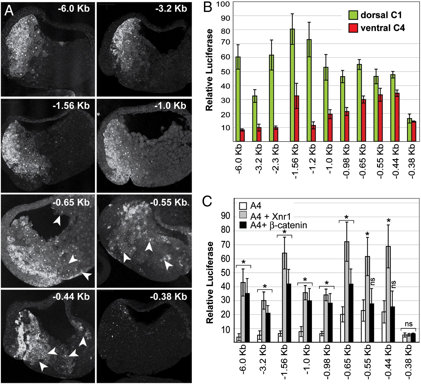 Fig. 3. Mapping Nodal and Wnt-responsive cis-elements. (A) Representative examples of GFP fluorescence from hhex:gfp deletion constructs in bisected transgenic gastrulae. Arrowheads show ectopic GFP. (B) Relative luciferase activity of early gastrulae injected with hhex:luc deletion constructs into either dorsal C1 (green), the ventral C4 cells (red) or (C) into the A4 ectoderm cells with xnr1 RNA (50 pg; gray) or stabilized pt-β-catenin RNA (250 pg; black). (BâC) Histograms show the average normalized luciferase activity and standard deviation from injections performed in biological triplicate. Representative examples from 3 independent experiments are shown. *p < 0.05 in Student T-tests when compared to injection of the same reporter alone; ns = no statistical difference. The NRE localized between â0.44 and â0.38 Kb, and the WRE between â0.65 and â0.55 Kb. |