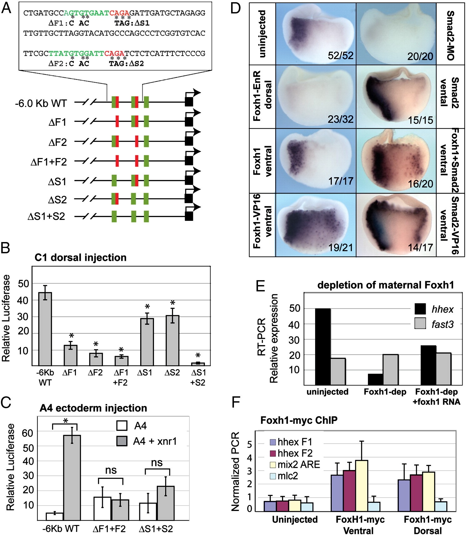 Fig. 5. Nodal-signaling directly activates hhex transcription through Foxh1/Smad2 binding in the proximal â0.44 Kb promoter. (A) Schematic and sequence of the NRE indicating the putative Foxh1 (green) and Smad (red) DNA-binding sites and corresponding âF and âS mutations. (BâC) Relative luciferase activity in gastrulae injected with the indicated reporter constructs into (B) the C1 dorsal mesendoderm or (C) the A4 ectoderm along with or without xnr1 RNA (50 pg). Histograms show the average normalized luciferase activity and standard deviation from a single injection experiment performed in biological triplicate. A representative from 3 independent experiments is shown. *p < 0.01 in Student T-test in (B) compared to the wt reporter or in (C) compared to injection of the same reporter alone; ns = no statistical difference. (D) Foxh1 and Smad2 regulate endogenous hhex expression. Hhex in situ of gastrulae injected into either dorsal or ventral cells with: foxh1-EnR RNA (500 pg), foxh1-VP16 RNA (200 pg), Smad2a/b -MOs (20 ng each), Smad2-VP16 RNA (200 pg) foxh1 RNA (250 pg), smad2 RNA (250 pg), or foxh1 + smad2 RNAs (125 pg each). (E) Normalized QRT-PCR of hhex and fast3 mRNA levels in gastrulae depleted of maternal Foxh1 and rescued by co-injection of foxH1 RNA (100 pg). (F) Normalized QPCR analysis of chromatin immunoprecipitated (in triplicate) from gastrulae injected dorsally or ventrally with Myc-Foxh1 RNA (50 pg). Primers amplified genomic DNA fragments containing the F1 or F2 Foxh1-sited in the hhex NRE, the mix2 ARE as a positive control and mlc2 promoter as a negative control. |
