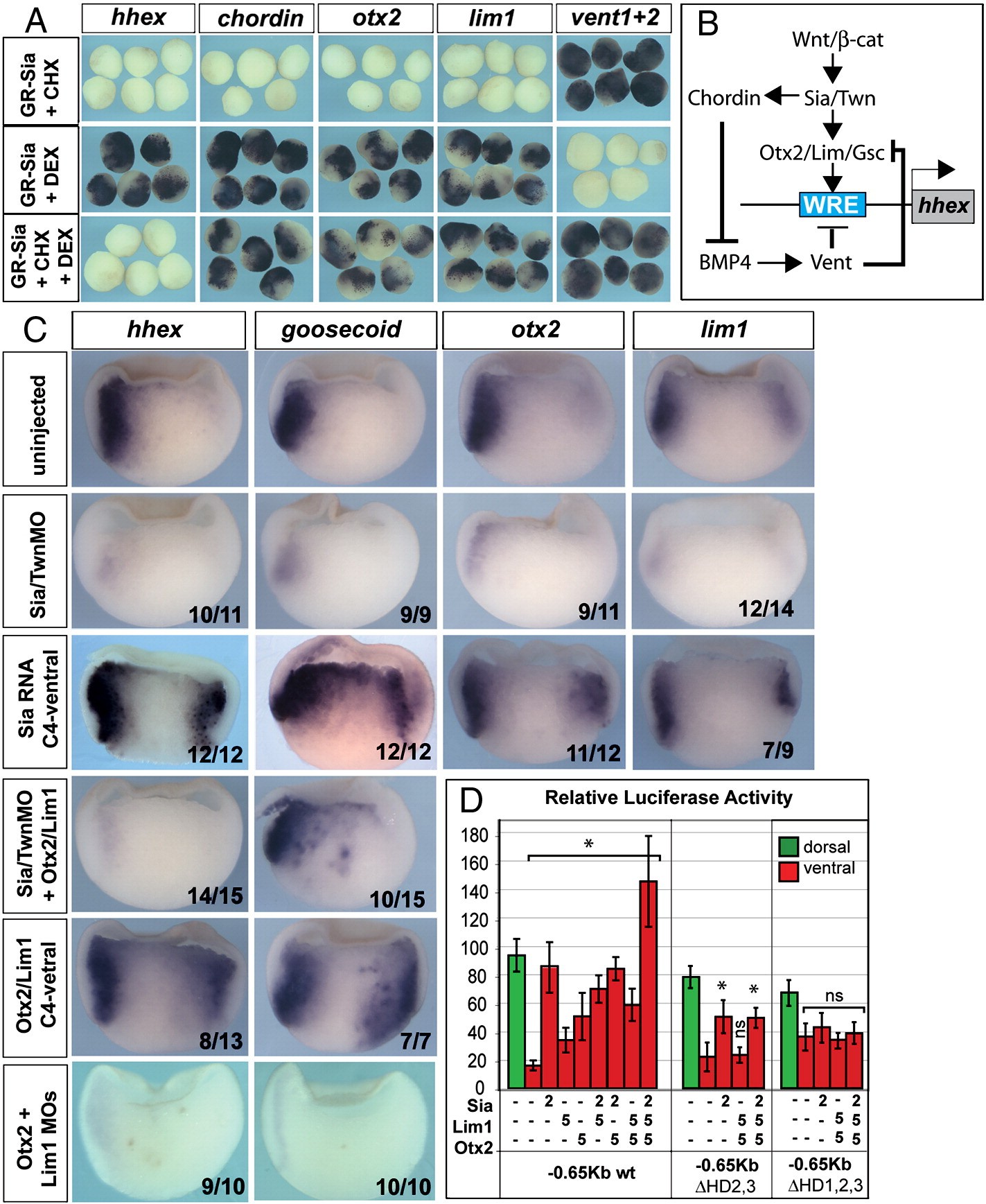 Fig. 7. Otx2 and Lim1 promote hhex transcription downstream of Sia/Twn. (A) GR-sia RNA (30 pg) + gfp RNA (200 pg) was injected into ventralâvegetal cells and explants were isolated at blastula stage based on GFP fluorescence. Explants were cultured with or without CHX for 30 min, and then DEX was added to activate the GR-Sia as indicated. In situ hybridization at stage 11 shows that chordin, otx2, and lim1, but not hhex are directly induced by GR-Sia in CHX treated explants. This experiment was repeated 3 independent times with identical results and > 10 explants for each condition. (B) A model showing two mechanisms by which Sia/Twn could promote hhex transcription. (C) Induction of hhex by Sia/Twn is partially mediated by Otx2 and Lim1. In situ hybridization of hhex, gsc, otx2, and lim1 in gastrulae injected as follows: Sia/Twn-MOs (20 ng each, dorsal 4-cell), sia RNA (50 pg, ventralâvegetal 8-cell), Sia/Twn-MOs (20 ng each, dorsal 4-cell) + otx2 and lim1 RNA (50 pg each dorsalâvegetal 8-cell), otx2 and lim1 RNA (50 pg each ventralâvegetal 8-cell), Otx2-MO + Lim-MO1 (20 ng each, dorsal 4-cell) or Gsc-MO (60 ng, dorsal 4-cell). (D) WT or âHD mutant â0.65 Kb hhex:luc reporters were injected into either C1 dorsal (green) or C4 ventral cells (red), with or without the indicated mRNAs (pg). Histograms show the average normalized luciferase activity and standard deviation from a single injection experiment performed in biological triplicate. A representative example from 3 independent experiments is shown. *p < 0.05 in Student T-test when compared to injection of reporter alone and ns = no statistical difference. |