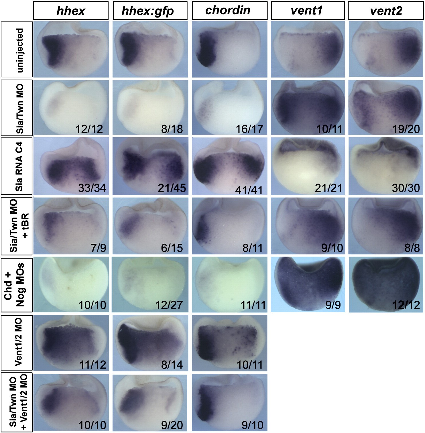 Fig. 8. Sia/Twn promote hhex transcription by inhibiting BMP and Vent. In situ hybridization of â6.0Kb hhex:gfp transgenic embryos injected as follows: Sia/Twn-MOs (20Â ng each, 4-cell dorsal), Sia/Twn-MOs (20Â ng each, 4-cell dorsal)Â +Â tBR mRNA (400Â pg, 8-cell dorsalâvegetal), Vent1-MOÂ +Â Vent2-MO (30Â ng each; 4-cell ventral), Sia/Twn-MOs (20Â ng each, 4-cell dorsal)Â +Â Vent1/2-MOs (30Â ng each, 8-cell dorsalâvegetal), Chordin-MOÂ +Â Noggin-MO (10Â ng each, 4-cell dorsal) or sia mRNA (50Â pg, 8-cell ventralâvegetal). |