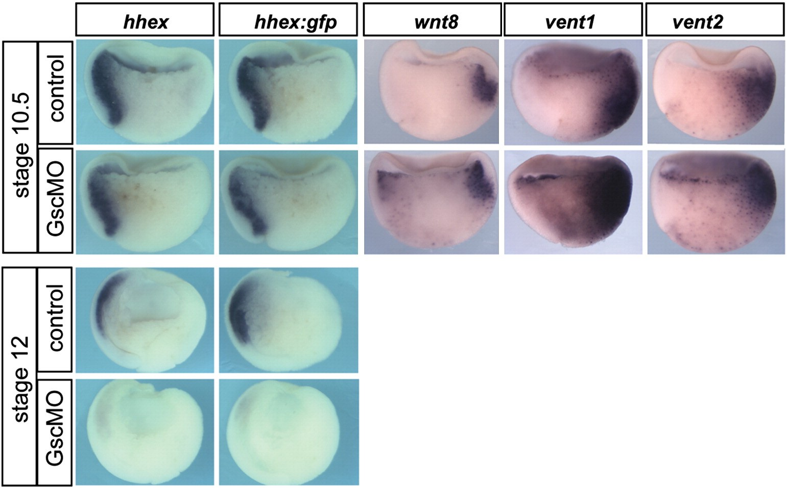 Figure S6. Gsc-depleted embryos. In situ hybridization of bisected hhex:gfp transgenic embryos injected with Gsc-MO (40 ng). At stage 10.5 Gsc-MO embryos exhibit increased wnt8, vent1, and vent2, mRNA levels, but hhex expression is unchanged. By stage 12.5 Gsc-MO embryos fail to maintain hhex expression. |