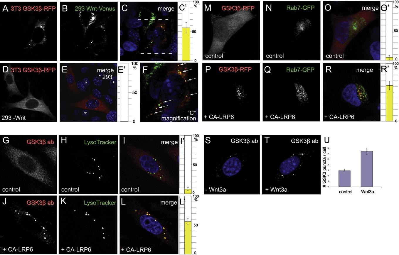 (M0 ) Rab7-GFP (green) and GSK3b-RFP (red) colocalized in CA-LRP6 signalosomes (in 62% 7% of GSK3-positive puncta, n = 80 HeLa cells); note GSK3