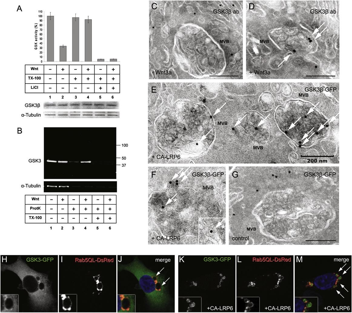 (K) In the presence of CA-LRP6, GSK3-GFP is translocated inside Rab5-QL giant multivesicular endosomes (see arrows) in 77% 9%, n = 80, of cotransfected
