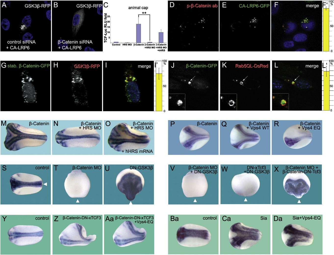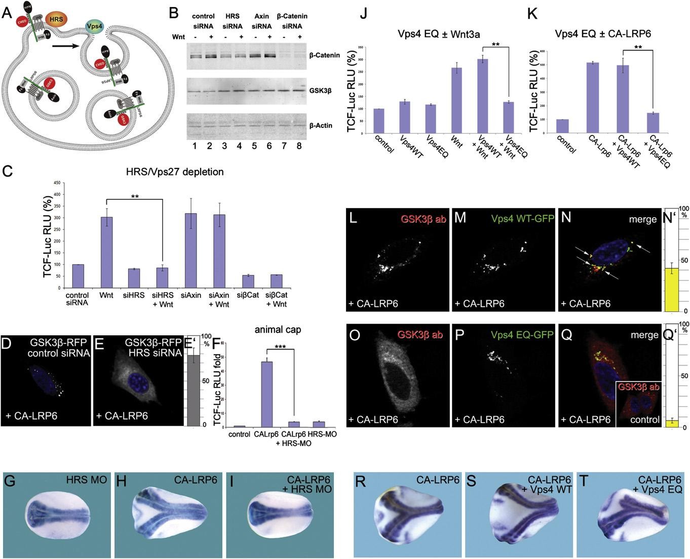 (O0 ) Overexpression of Vps4-EQ-GFP inhibits sequestration of endogenous GSK3b in CA-LRP6 signalosomes. (R) Head formation in axes induced by