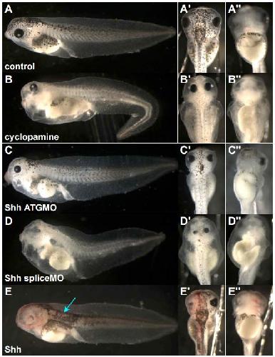 Fig. S3. Loss of Shh signaling and Hh signaling cause similar developmental defects. (A) Control embryos at stage 42, lateral (A), dorsal, (A') and ventral (A") views. (B) Cylopamine treatment blocks all Hh signaling, resulting in reduced melanocytes, edema, and kinked tail (B), closely spaced eyes (Bâ), and gut-looping defects (B"). Injection of MOs designed to the translation start site (âShh ATGMO,â CâC") and splice donor site (âShh spliceMO,â DâD") show similar phenotypes. (E) Injection of Shh mRNA (pink, lacZ staining) results in excess melanocytes (D, arrow), ventralization of the eye (E, E'), and gut looping defects (E"). |