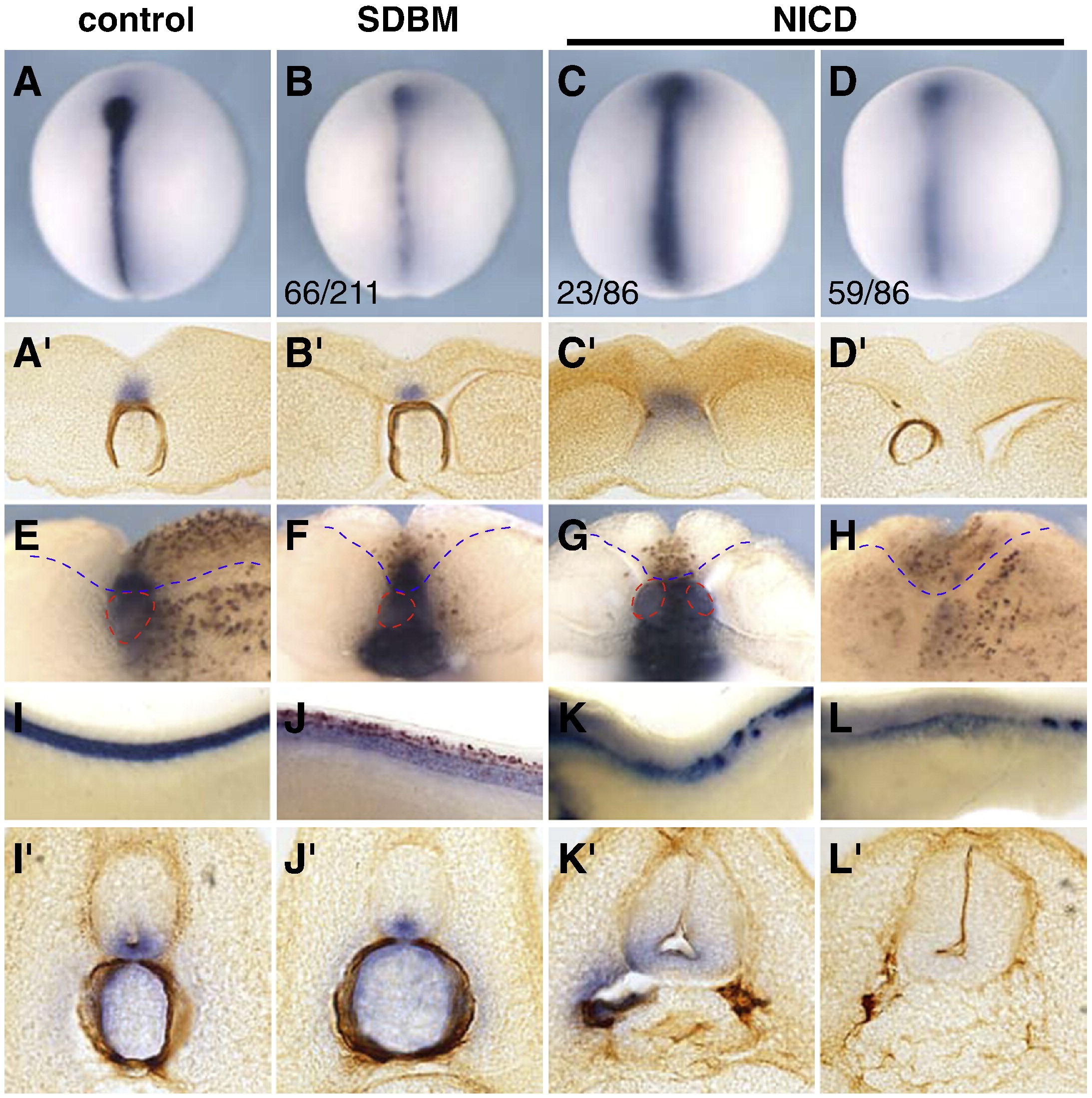 Fig. 2. Perturbation of Notch signaling has variable effects on Shh expression. Shh expression in neurula (st.16, AâH) and tadpole (st.35, IâL) embryos upon blockade (B, F, J) and activation (C, D, EâH, K, L) of Notch signaling. Shh is expressed in the floor plate and notochord (A, A', I, I'). Blockade of Notch signaling led to a slight reduction in the floor plate domain of Shh in 31% of embryos (B, B'), but many embryos showed normal expression (J', 69%). Activated Notch signaling led to increased expression throughout the midline (C, C'), though the floor plate domain was normal (F, K'), in 27% of embryos. In a significant proportion of embryos (69%, p < 0.05), activated Notch led to a decrease in Shh expression throughout the midline (H, L') or in the floor plate domain (G). In NICD tadpoles, Shh expression was decreased and/or patchy in the spinal cord (K, L). The variable response of Shh to Notch activation is not correlated with amount or distribution of NICD protein (EâH, αnti-myc staining for NICD-myc in brown). NICD in the lateral neural plate does not cause ectopic Shh expression (E), while NICD in the FP domain can result in Shh expression (F), or repression (G, H). (A'âD') Transverse sections of (AâD); faint notochord expression of Shh is not visible in thin sections. (EâH) αnti-myc staining (brown) was performed on transversely bisected embryos after ISH for Shh (purple). The notochord is outlined in red and the ventral boundary of the neural plate in blue. (IâL) Lateral view of tailbud stage embryos. (I'âL') Transverse vibratome sections through middle of spinal cord at tailbud stages. |