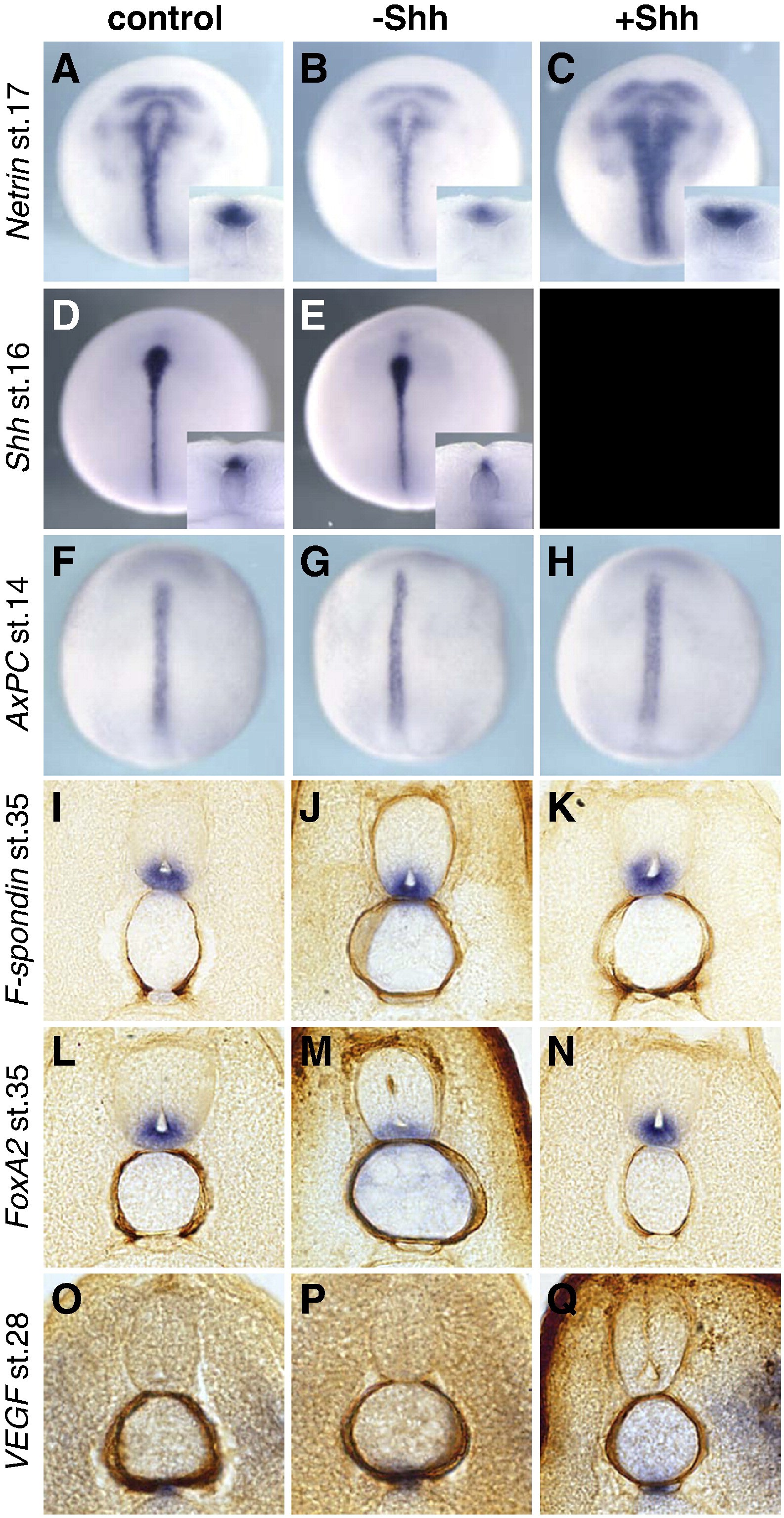 Fig.3. Shh is not a major regulator of dorsal midline fates. Shh signaling was blocked by injection of Shh MO or by cyclopamine treatment (ââShhâ B, E, G, J, M, P) and activated by injection of Shh mRNA (â+Shh,â C, H, K, N, Q). Netrin expression in the floor plate was decreased in 42% of â Shh embryos (B, N = 387) and slightly upregulated in 44% of + Shh embryos (C, N = 139). Floor plate expression of Shh was slightly narrower in 29% of embryos with blockade of Shh signaling (E inset, N = 194). Perturbation of Shh signaling had no effect on notochord (AxPC, FâH and Tor70, IâQ) or hypochord (OâQ) or floor plate markers F-spondin and FoxA2 in the spinal cord of tadpoles (IâN). (AâH) Dorsal views, anterior up, with transverse bisection in inset (AâE). (GâO) Transverse vibratome sections through middle of spinal cord at tailbud stages. |