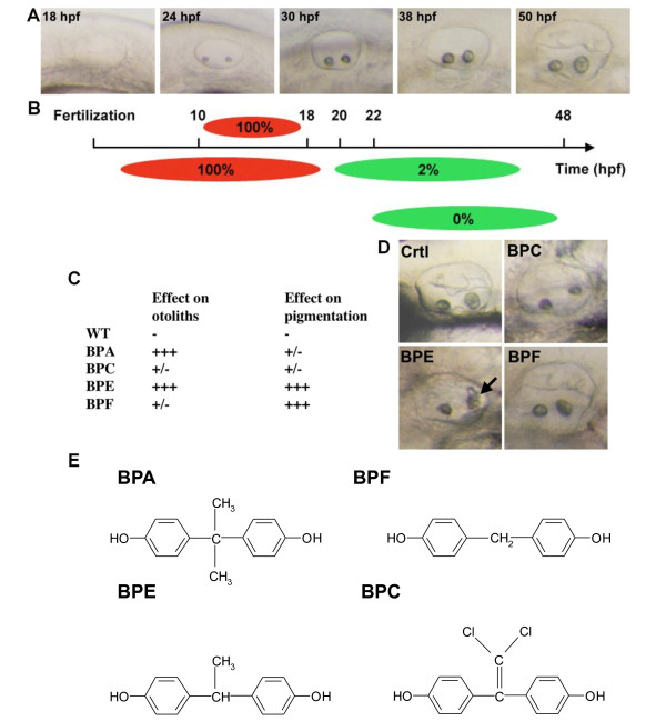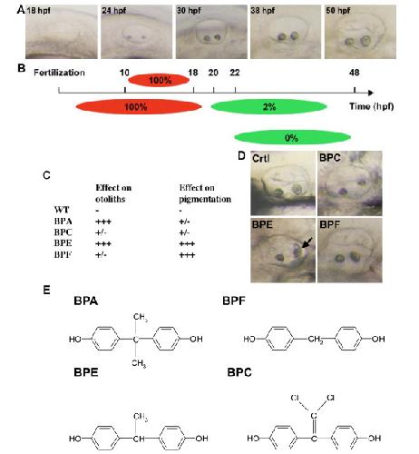 Figure 2. Bisphenol effects are time and compound specific. A: Live pictures of the developing otic vesicle from 18 to 50 hpf in zebrafish embryo. B: BPA affects otolith in a restricted time window. Diagram showing the effect of 70 μM BPA treatments with different starting points or length of exposure. Upper panel: BPA pulse treatments (red bars) were performed from 10 hpf. At different stage of development (18, 24, 30 and 38 hpf) embryos were washed and developed in BPA free medium (gray bars). Otic vesicles were scored at 50 hpf. Lower panel: BPA acts prior 22 hpf to induce otolith defects. Treatments started prior or at 18 hpf lead to 100% of otolith defects. Treatment started from 20 hpf onwards lead to 85% of embryos with otolith defect. Treatment started at 22 hpf lead to only 2% of affected embryos. Treatments started later did not lead to any otolith defect. Red bars represent time when embryos were exposed to BPA. Gray bars represent time when embryos were not exposed to this compound. C: Various bisphenols affect otolith development and/or pigmentation. Embryos were treated from 5 to 72 hpf and malformed otolith or pigmentation defects scored (+++ indicates maximum defect, i.e. malformed otolith or total lack of pigment). Treatment of embryos with either BPA (70 μM) or BPE (70 μM) resulted in malformed otoliths. BPE also affected pigmentation, as did BPF (50 μM). BPC (70 μM) was without clear effects in these assays. D: Pictures of the effect of BPC, BPE and BPF on otolith development. All embryos were exposed to 70 μM of bisphenol. Note that only BPE gives an otolith phenotype similar to what in observed in BPA treated embryos with otolith aggregates marked by a black arrow. E: Chemical structures of BPA, BPC, BPE and BPF. |