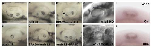 Figure 6. Chemical inhibition of Na/K ATPase rescues the BPA induced phenotype. (A) 50 hpf control embryo with two normal otolith. (B) Treatment with 1.8 mM ouabain from 6 hpf onwards leads to one misformed otolith. (C) Embryo treated with 70 μM BPA from 5 hpf onwards leads to otolith aggregates. (D) Co treatment with 70 μM BPA and 1.8 mM oubain from 6 hpf onwards leads to normal otolith. (E) Co treatment with 70 μM BPA and 0.9 mM oubain from 6 hpf onwards leads to a mild BPA like phenotype. In some cases one almost normal otolith is found (arrow). (F) Co treatment with 50 μM BPA and 1.8 mM oubain from 6 hpf onwards leads to two normal otoliths. (G)α1a1 morphants display a complete absence of otolith. (H) 70 μM BPA of α1a1 morphants did not rescue otolith formation and result in a complete absence of otolith. (I)α1a1 is expressed in the lower membrane of the otic vesicle at 24 hpf. (J) A similar expression of α1a1 is detected in BPA treated embryos. |