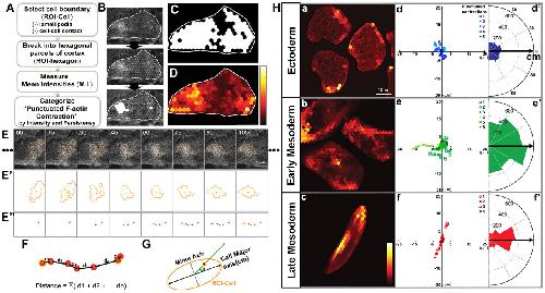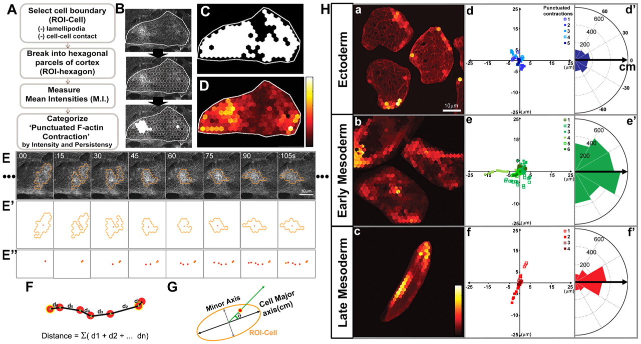 Fig.4. Quantitative analysis of contraction morphology. (A) Flow-chart for the image-processing steps used to identify the contractile actin cortex and categorize the individual punctuated F-actin contraction. (B) The identifying steps applied on a live-cell moeâGFP confocal image of an anterior mesoderm cell. The cell boundary of the selected cell (ROI-Cell) is shown with a white line, which is divided into hexagonal parcels (ROI-hexagon). White-filled ROI-hexagons are the identified ROI-hexagons containing âactiveâ actin cortex. (C) The contractile area displays the region where a contractile F-actin cortex was present in at least a single frame during the 30 minutes. (D) The incident frequency of F-actin contractions in each ROI-hexagon is shown by the F-actin frequency map. A 30-minute time-lapse was used for C and D. (E) A time-lapse movie following moeâGFP identifing punctuate F-actin contractions. (Eâ²âEâ²) The identified positions (red dots) of the center of intensity of a categorized actin contraction enclosed by the hexagonal area. (F) The distance of movements is the sum of segmented distances for one episode of an F-actin contraction. (G) Anglular distributions of the positions of F-actin contractions with respect to the major cell (cm) axis represented by angle θ. (H) (aâc) F-actin frequency maps from a confocal time-lapse movie of moeâGFP-expressing ectoderm (a), early mesoderm (b), and late mesoderm (c) cells. (dâf) Scatter plots display relative movement vectors of F-actin contractions from one representative cell starting from its origin (0,0). (dâ²âfâ²) Circular histograms represent the angular distribution of the punctuate F-actin contractions with respect to the cell major axis. (see G for the method: the major cell axis is set to 0, the angle between the F-actin contraction and the major cell axis is θ). The heat-map colors in (D) and (H) indicate an arbitrary frequency scale from high frequency or high persistence âlightâ to low frequency or low persistence âdarkâ (see supplementary material Tables S1 and S2 for a summary of the quantified punctuated F-actin contractions). |