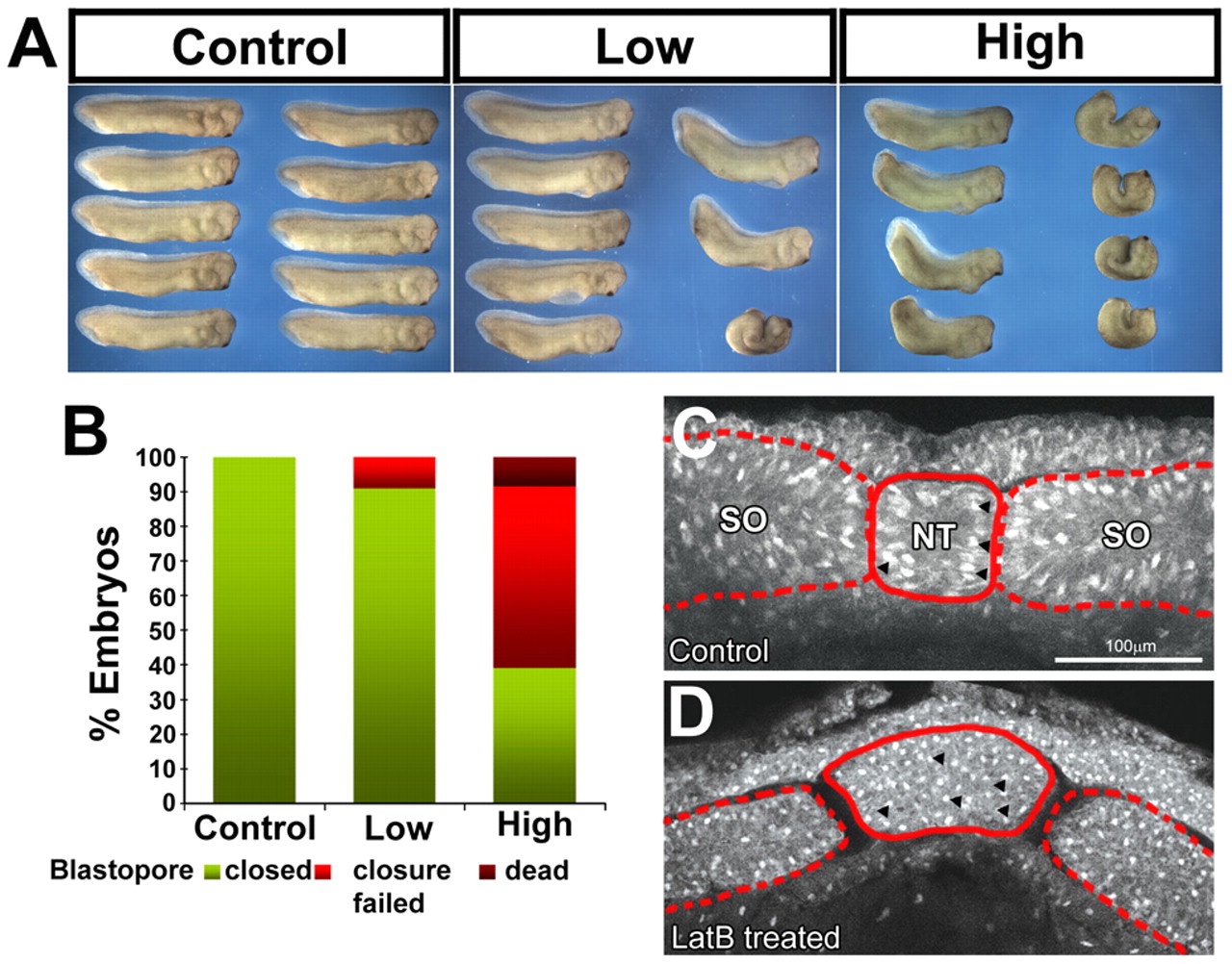 Fig.1. Transient actin depolymerization results in failure of convergent extension. (A) Xenopus laevis embryos were transiently treated for 20 minutes during gastrulation with low (0.6 μM) or high (1.2 μM) concentrations of LatB. LatB was washed out and whole embryos were cultured until they reached the tadpole stages. Embryos exposed to a pulse of LatB during mid-gastrulation developed with a short and bent axis in a dose-dependent manner. (B) Blastopore closure defects increase with the concentration of LatB. (C) Transverse-sectioned dorsal tissue of control embryos show ordered positioning of nuclei within two cell layers in mesoderm (arrowheads). (D) Three hours after the LatB pulse and wash, dorsal tissue has randomly positioned rounded cells in multiple layers that thicken both the ectoderm and mesoderm. Cell shapes are visualized by rhodamineâdextran injection at the single-cell stage. SO, somite; NT, notochord. |