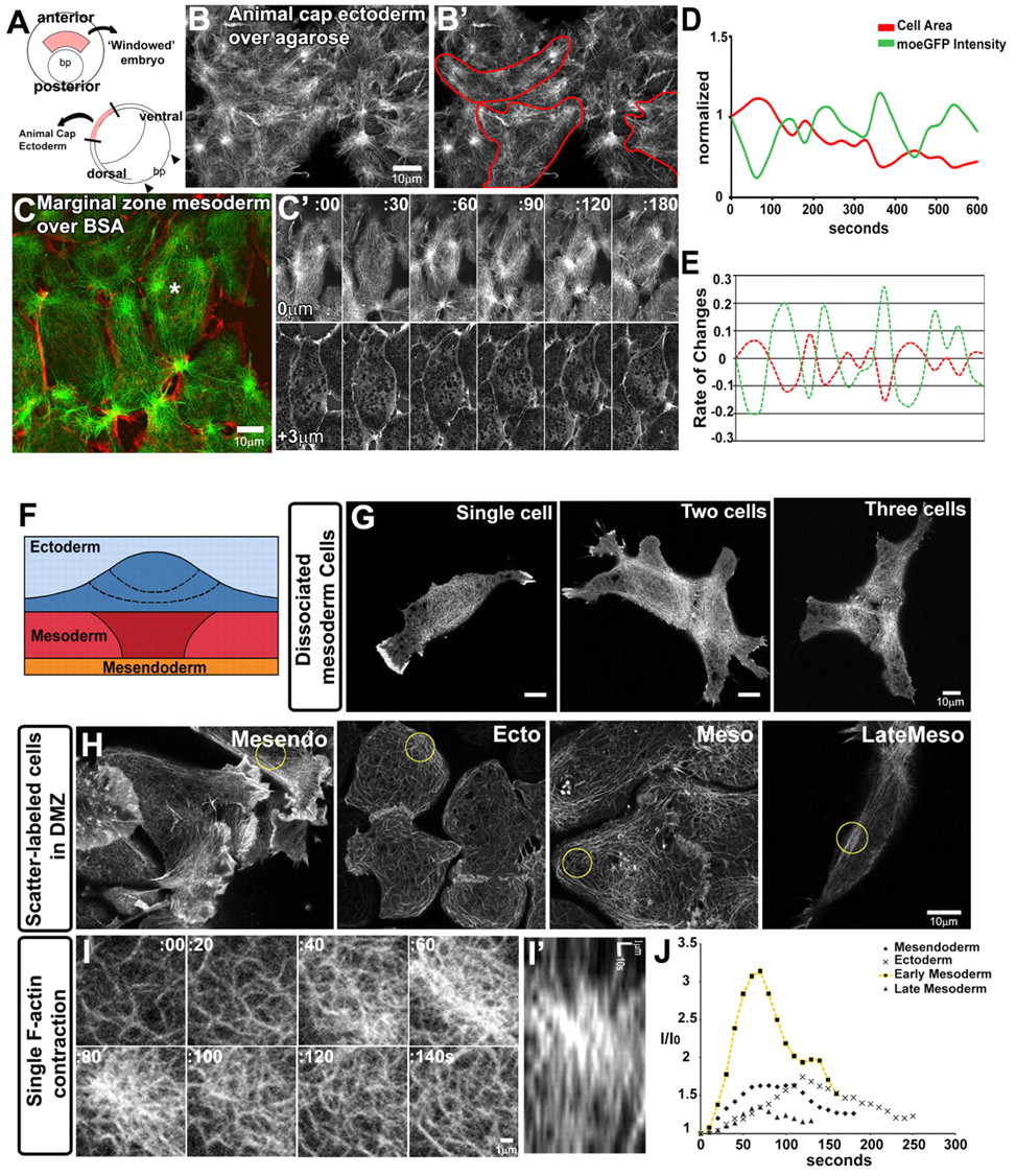 Fig.3. Punctuated F-actin contractions regulate cell shape. (A) A schematic of the gastrula from the vegetal view (left) and sagittal view (right). bp, blastopore. Mesoderm cells (pink) are exposed by removing the epithelial sheet from the embryo, to give the âwindowed embryoâ, in order to observe the dynamics of cells and F-actin (as shown in C). Confocal images from a time-lapse movie of moeâGFP-expressing animal cap ectoderm on agarose (B,Bâ²) and marginal zone mesoderm from the windowed embryo (C,Câ²). Confocal sections were taken at two depths, either for the F-actin cortex (green) or for the cell outline (red), in order to capture the dynamics of both cell behaviors and F-actin. Câ² shows images from the time-lapse movie of the marked cell in C. (D) The cell area is inversely correlated with the moeâGFP intensity from the cell (results are from the marked cell in C). As the area of the cell decreases (or cells contract their body), the moeâGFP intensity increases (the F-actin network gets tensed). (E) The mean cross-correlation coefficient for the rate of changes between the cell area and the moeâGFP intensity is â0.76 (12 cells from three time-lapse movies). (F) A fate map of the marginal zone explant. (G,H) Confocal images of moeâGFP from dissociated mesoderm cells and cells in the dorsal marginal zone (DMZ) tissue, including mesendoderm, ectoderm, early mesoderm and late mesoderm cells. (I) A time series of confocal images of a single cortical F-actin contraction within an early mesoderm cell. (Iâ²) Kymograph of intensities through the mid-line of the same contraction as in (I). (J) MoeâGFP intensity profiles in the circular region of (BâD) for one episode of F-actin contraction shown as the normalized intensity (I/I0; I0 is initial intensity) within a circular region of each cell type (yellow circles in the scatter-labeled cells in H) over a single contraction. |