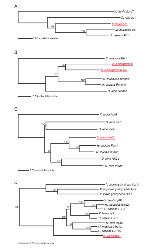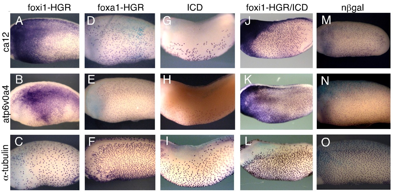 Genes referenced: atp6ap1 atp6ap2 atp6v0a4 atp6v0b atp6v0c atp6v1b1 atp6v1c2 atp6v1e1 atp6v1f atp6v1h bbof1 ca12 ca2 ccs clcnkb crygdl2.2 cyp3a5 fetub foxa1 foxi1 foxi2 foxj1 maml1 neurl1 notch1 slc26a4 slc26a4.2 slc26a4.3 slc26a4l slc4a1 slc4a7 tfcp2l1 tuba4a ubp1 XB22062446