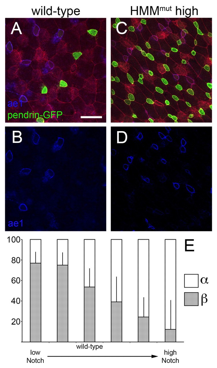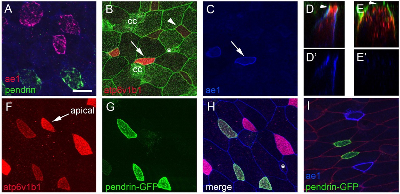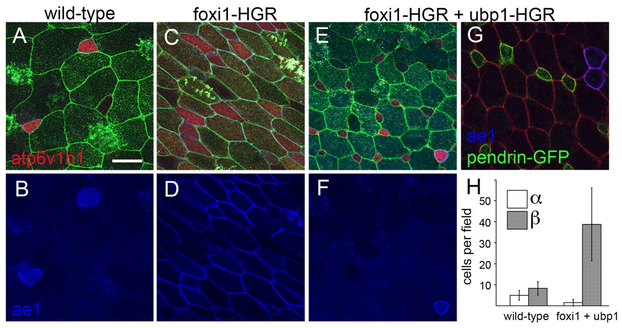 Specialized epithelial cells in the amphibian skin play important roles in ion transport, but how they arise developmentally is largely unknown. Here we show that proton-secreting cells (PSCs) differentiate in the X. laevis larval skin soon after gastrulation, based on the expression of a `kidney-specific' form of the H(+)v-ATPase that localizes to the plasma membrane, orthologs of the Cl(-)/HCO(-)(3) antiporters ae1 and pendrin, and two isoforms of carbonic anhydrase. Like PSCs in other species, we show that the expression of these genes is likely to be driven by an ortholog of foxi1, which is also sufficient to promote the formation of PSC precursors. Strikingly, the PSCs form in the skin as two distinct subtypes that resemble the alpha- and beta-intercalated cells of the kidney. The alpha-subtype expresses ae1 and localizes H(+)v-ATPases to the apical plasma membrane, whereas the beta-subtype expresses pendrin and localizes the H(+)v-ATPase cytosolically or basolaterally. These two subtypes are specified during early PSC differentiation by a binary switch that can be regulated by Notch signaling and by the expression of ubp1, a transcription factor of the grainyhead family. These results have implications for how PSCs are specified in vertebrates and become functionally heterogeneous.