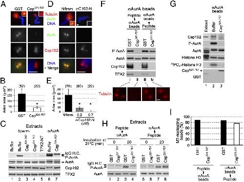 Fig. 3. Cep192-mediated AurA activation is essential for MTOC function. (A and D) Localization of AurA and Cep192 on centrosomal asters assembled in extracts supplemented with 3 μM GST or Cep521â757 (A) or with 0.7 μM nonimmune IgG or αCep192-N (D). (Scale bars: 2.5 μm.) (B and E) Quantitation of MT aster surface area in A and D, respectively. The results obtained in the presence of 0.2 μM αCep192-N are also shown for comparison (E). Error bars, SD. *P < 0.0001 compared with the corresponding control extract, as determined by a two-tailed Student's t test. The number of asters analyzed is shown in parentheses. (C) W-blot of extracts incubated with XB buffer, Cep521â757 (3 μM), or TPX2-NT (6 μM) in the absence or presence of sperm nuclei (4 à 104/μL) or αAurA (0.6 μM). (F) W-blots and images of αAurA beads that were added to extract before (iii and iv) or after (i and ii) its incubation with 3 μM GST or Cep521â757 on ice. (Scale bar: 10 μm.) (G) In vitro kinase assay of endogenous AurA complexes isolated from egg extract incubated with XB buffer or Cep521â757 (3 μM). The reaction products were resolved by SDS/PAGE and transferred onto a nitrocellulose membrane, which was subjected to autoradiography (32PO4-histone H3 row) followed by W-blotting (the remaining rows). (H) W-blots of extracts incubated with soluble αAurA (0.5 μM) added either before (lanes 5â8) or after (lanes 1â4) incubation of extracts with 3 μM GST or Cep521â757 on ice. (I) Quantitation of MT-nucleating αAurA beads in F, Lower.