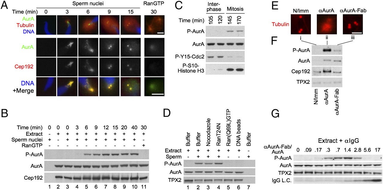 Fig. 1. AurA activation and MT assembly promoted in egg extract by sperm nuclei and αAurA beads. (A) Localization of AurA and Cep192 during MT assembly promoted by sperm nuclei-associated centrosomes (time course) and RanGTP. (Scale bars: 5 μm.) (B) W-blots showing the time course of AurA activation in extract by sperm nuclei (4 à 104/μL). (C) Extract was driven into interphase by the addition of calcium and supplemented with demembranated sperm nuclei (2 à 103/μL). Extract aliquots were withdrawn at the indicated times after sperm addition and analyzed by W-blotting using the indicated antibodies. (D) W-blots of extracts supplemented with XB buffer, nocodazole (50 μM), RanT24N (30 μM), Ran(Q69L)GTP (30 μM), or DNA beads (0.1 μL/μL). Where indicated, reaction mixtures contained sperm nuclei (4 à 104/μL). (E and F) Beads coated with nonimmune IgG (N/Imm), αAurA, or αAurA-Fab were incubated in rhodamine-tubulin+Ran(Q69L)GTP-supplemented extract and analyzed by fluorescence microscopy (E) and W-blotting (F). (Scale bar: 10 μm.) (G) W-blots of extract incubated with 1.7 μM goat anti-rabbit IgG, IgG fraction (αIgG) and increasing concentrations of αAurA-Fab [detected as IgG light chain (IgG L.C.)]. The concentration of AurA in egg extract is â0.35 μM.