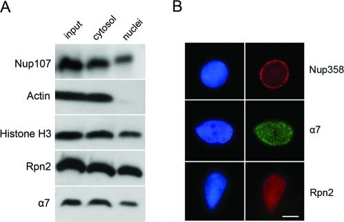 FIGURE 1:. Nuclear targeting of proteasomes. (A) In vitro reconstituted nuclei were separated from the surrounding cytosol by centrifugation through a sucrose cushion, as described in Materials and Methods. Total reaction, cytosolic, and nuclear fractions were immunoblotted with specific markers. Note that actin is exclusively cytosolic, while a fraction of the histone and nucleoporin markers are recruited to nuclei within the time of incubation. The α7 and Rpn2 proteasome subunits are also significantly recruited to the nuclear fraction. (B) Reconstituted nuclei were fixed and processed for indirect immunofluorescence. DNA was stained with Hoechst 33258 (left column). Anti-Nup358 exhibits the typical punctuate rim staining of NPC components. Both α7 and Rpn2 antibodies exhibit punctuate staining throughout the nucleus. Scale bar, 10 μm. |