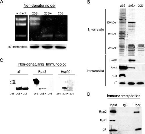 FIGURE 3:. Biochemical purification of three distinct species of proteasome particles. (A) Migration of endogenous proteasomes (extract) and purified particles (designated 26S, 20S+, and 20S) in native gels. Active particles were visualized by the Suc-LLVY-AMC peptide, which becomes fluorescent upon proteolytic cleavage in the internal cavity of the proteasome core particle. The slower migrating top two bands correspond to single- and double-capped 26S forms known from yeast extracts and other systems. The 20S+ particle shows higher peptidase activity than an equivalent sample of the 20S CP. (B) Silver staining (top) and immunoblot analysis (bottom) of samples of the three purified particle preparations, following denaturing SDS–PAGE. The blot was probed with antibodies directed against α7 (a 20S CP subunit), Rpn2 and Rpt1 (19S subunits), and Hsp90, which is only detected in the 20S+ particle. (C) Identical samples of the three purified particle preparations (26S, 20S+, and 20S) were loaded for the in-gel peptidase activity assay shown in (A) and in three native gels used for immunoblotting. Equal loading based on anti-α7 reactivity in a denaturing immunoblot is shown in the bottom strip of (A). The native blots were probed against α7, Rpn2, and Hsp90, all of which were detected in the single band of the 20S+ particle. (D) Immunoprecipitation out of Xenopus egg cytosol was performed with affinity-purified antibodies generated against the central PC-repeat domain of xRpn2, or control rabbit IgG. Rpn2 and α7 were coimmunoprecipitated, but Rpt1 was missing, indicating the presence of an endogenous particle in the extract containing the 20S CP together with an exposed Rpn2 subunit. |