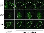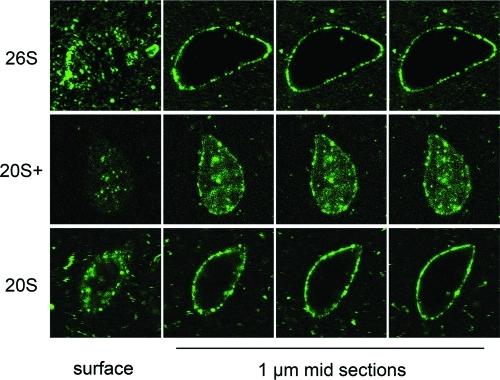 FIGURE 4:. Nuclear targeting and import of fluorescently labeled proteasomes. Purified 26S, 20S+, and 20S particles were fluorescently labeled and added into nuclear reconstitution reactions after the assembly of functional nuclei had been completed. Samples were fixed and analyzed by confocal microscopy. For each of the three particles a representative nucleus is shown, starting with a surface (top) view section on the left, and followed by three consecutive 1-μm-thick confocal sections through the middle of the nucleus. The labeled 26S and 20S particles accumulate at the nuclear envelope, while the 20S+ particle reaches the nucleoplasm. |