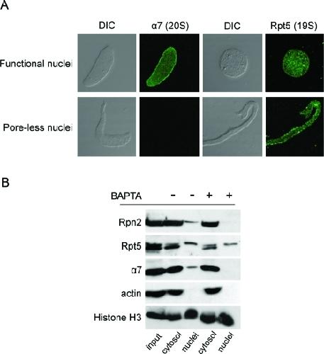 FIGURE 8:. Different 19S subunits show distinct nuclear targeting properties. (A) Normal (functional) nuclei and BAPTA-inhibited (poreless) nuclei were immunostained with anti-α7 and anti-Rpt5 and analyzed by confocal microscopy. Differential interference contrast (DIC) images and confocal midsections are shown for all nuclei. The 20S CP subunit α7 was missing from poreless nuclei, but anti-Rpt5 strongly stained these nuclear assembly intermediates. (B) Nuclear and cytosolic fractions were separated and compared between normal and BAPTA-inhibited nuclei, as in Figure 2B. Immunoblotting of the separate fractions confirmed that Rpt5 was present in the nuclear fraction in both normal and poreless nuclei, while α7 and Rpn2 only associated with normal nuclei. |