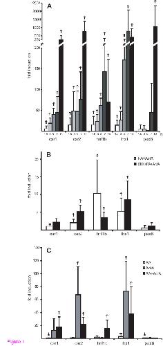 Figure 1. Time dependent induction of the early nephrogenic transcription factors in retinoic acid and activin A treated animal caps. (A) Animal caps were cut at the late blastula stage 9 [36] and incubated for 1.5 or 3 hours in retinoic acid (10-4M) and activin A (10 ng/ml). For 5, 7 and 13 hours treatments retinoic acid and activin A was replaced after three hours with Steinberg's solution [15]. The mRNA levels were analysed by quantitative RT-PCR using the primers given in Additional file 2. The standard deviations from four independent animal cap pools (N = 30) are given and alterations are indicated by an upward arrow, if all four induction values were higher than one for a given probe. To detect osr2 transcripts primers targeting osr2B, the splice variant predominantly expressed in Xenopus laevis (compare Figure 2Bs) were used for two animal cap pools analyzed after 3, 5 and 7 hours and three after 13 hours In all other experiments primers targeting both splice variants were used. (B) Animal caps cut at the late blastula stage 9 were incubated with or without cycloheximide (CHX, 5 μg/ml) for 30 min and then stimulated for 1.5 hours in retinoic acid (10-4M) and activin A (10 ng/ml). RNA was quantified from six pools (N = 30) and upward arrows indicate induction for all six experiments. (C) Animal caps were cultured for three hours in retinoic acid (RA, 10-4M), activin A (ActA, 10 ng/ml) or both inducers together (RA+ActA) and then analysed by quantitative RT-PCR. The standard deviations from five (RA) or four (ActA or RA+ActA) independent animal cap pools (N = 30) are given and reproducible induction or reduction is indicated by an upward or downward arrow, if increased or decreased in all samples, respectively.