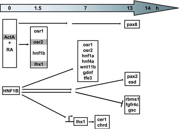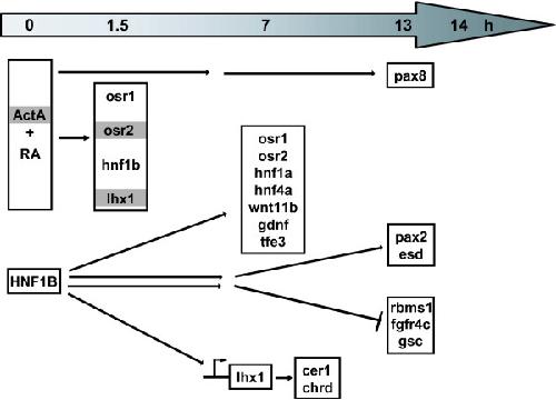 Figure 7. Induction of the early nephrogenic transcription factors and other genes in animal caps. osr1, osr2, hnf1b and lhx1 are induced already after 1.5 hours treatment with activin A (ActA) and retinoic acid (RA) suggesting that they are direct targets, whereas pax8 is first expressed after thirteen hours implying an indirect activation. osr2 and lhx1 (highlighted in grey) are induced after three hours by activin A alone. HNF1B overexpressed in animal caps induces after seven hours osr1, osr2, hnf1a, hnf4a, wnt11b, gdnf and tfe3. After fourteen hours pax2 and esd are increased and rbms1, fgfr4c and gsc are decreased suggesting secondary effects. HNF1B induces the expression of lhx1 by an HNF1 binding site in its promoter region (arrow). Furthermore, the lhx1 target genes cer1 and chrd are induced in HNF1B injected animal caps possibly via lhx1.
