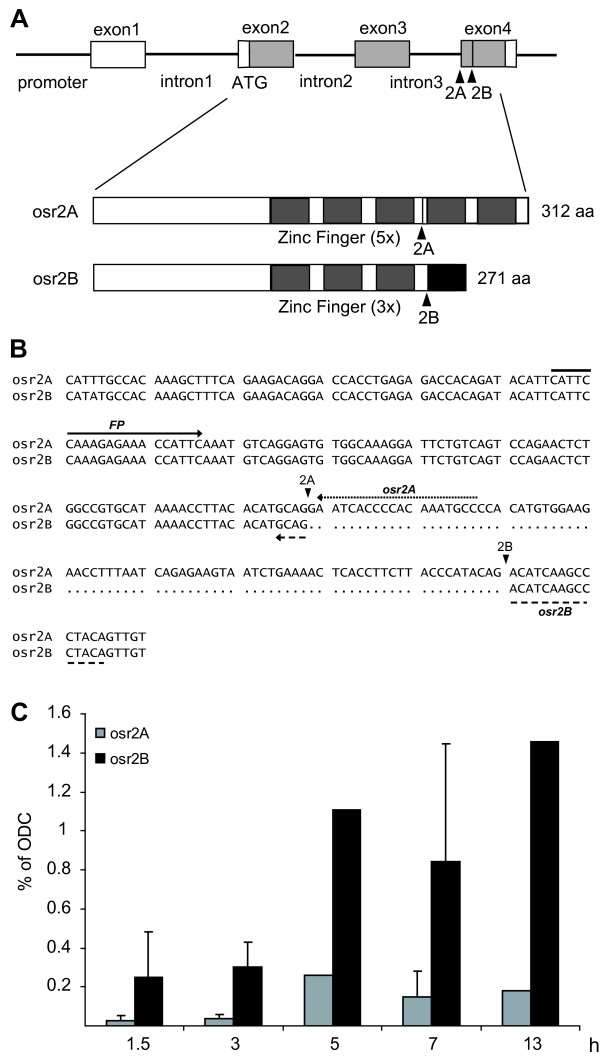 Figure 2. Splice variants of Xenopus osr2. (A) Schematic representation of the Xenopus osr2 splicing variants A and B based on the mammalian data [35] shows alternative splice sites 2A and 2B indicated by arrowheads. Boxes represent exons and filled areas reflect open reading frames, while lines represent the promoter and introns. In the lower panel a scheme of the five and three zinc-finger domains (grey boxes) in osr2A and in osr2B protein is given, respectively. The black box in osr2B denotes the alternatively spliced exon 4. (B) Alignment of the nucleotide sequence around alternatively spliced exon 4 is based on a Xenopus laevis osr2B full-length cDNA sequence (accession no. BC108579), whereas the corresponding osr2A cDNA of Xenopus tropicalis (accession no. CU075721) is taken, as no corresponding Xenopus laevis cDNA is available. The nucleotide sequence around alternatively spliced sites 2A and 2B (indicated by arrowheads) is conserved in both species. The forward primer FP is identical for both splice variants, whereas the reverse primers distinguish between osr2A and osr2B. (C) Animal caps were cut at the late blastula stage 9 [36] and incubated for 1.5 or 3 hours in retinoic acid (10-4M) and activin A (10 ng/ml). For 5, 7 and 13 hours treatments retinoic acid and activin A was replaced after three hours with Steinberg's solution as originally described [15]. The mRNA levels were analysed by quantitative RT-PCR using the specific primers for osr2A and osr2B (see Additional file 2) and the results are normalized to odc expression levels. If two independent pools were analysed, the mean is given and the bar marks the two values.