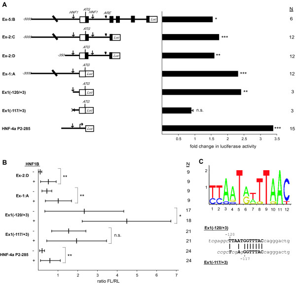 Figure 6. Functional identification of HNF1 binding sites in the promoter region of lhx1 in HEK293 cells and in animal caps. (A) HEK293(HNF1B) cells [45] were transfected with lhx1 gene firefly luciferase fusion constructs and HNF1B expression was induced by adding doxycycline. On the left panel schematic drawings of transfected lhx1 promoter luciferase fusion constructs (not to scale) are given. Lines represent promoter and intron regions, boxes are exons with protein coding (filled) or untranslated (open) regions (adapted from [42]). Arrows mark potential HNF1 binding sites identified by JASPAR [44]. The arrow head marks the ARE (activin response element) in intron 1 [42]. The Ex1(-120/+3) construct contains the complete HNF1 binding site in the promoter region of lhx1, whereas the binding site in the Ex1(-117/+3) construct is partially deleted (compare panel C). The HNF-4a P2-285 construct contains the P2-promoter of the HNF-4a gene which is regulated by HNF1B [46]. The fold change of luciferase activity of transfected constructs in doxycycline induced HEK293(HNF1B) versus untreated cells is given using the renilla luciferase reporter pRL-Con as an internal control. The Student's t-test was used and *, ** and *** refer to p-value of ≤ 0.05, ≤ 0.01 and ≤ 0.001, respectively and n.s. means not significant. N is the number of independent transfections made. (B) The luciferase reporter constructs (50 pg each) were tested in animal caps of controls or HNF1B (150 pg) injected embryos. The luciferase activity was measured in pools of four animal caps after four hours cultivation in Steinberg's solution. To calculate the increase of luciferase activity in HNF1B injected animal caps the ratio of firefly luciferase (FL) to renilla luciferase (RL) was used (FL/RL). The vertical line in the middle represents the mean and the small bars the standard deviation. Since experiments with different pools of animal caps were not comparable in quantitative terms, we used the Mann-Whitney-test to score significant differences. * and ** refer to p-value of ≤ 0.05 and ≤ 0.01, respectively and n.s. means not significant. N is the number of animal cap pools tested. (C) The upper panel shows the sequence logo of HNF1 binding site given in JASPAR [44] and the lower panel the sequences of the HNF1 binding site (capital letters) in Ex1(-120/+3) and Ex1(-117/+3) constructs. The vector sequence is indicated by italics.
