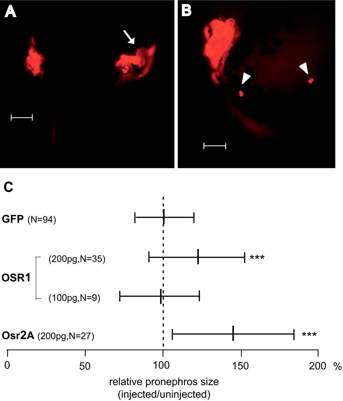 Figure 3. Expression of OSR1 and Osr2A leads to an increase of pronephros size in Xenopus laevis larvae. (A) Enlargement of pronephros: Dorsal view of stage 45 larvae [36] injected with 200 pg OSR1 mRNA and whole-mount immunostained with antibodies 3G8 and 4A6 [37]. The injected side is marked by an arrow. Bar = 200 μm (B) Ectopic kidney cell patches (marked by arrow heads): Lateral view of a stage 45 larvae [36] expressing OSR1 and prepared as in A. Bar = 200 μm (C) Pronephros size on injected versus control side in OSR1 or Osr2A injected embryos was determined in lateral views by measuring the area through the widest part of the immunostained pronephros. The Student's t-test was used to score significant differences. The p-value is given by comparing embryos injected with gene of interest plus GFP mRNA as marker with those injected with GFP mRNA taken from previous data [23]. *** denotes p-value ⤠0.001. The vertical line in the middle represents the mean and the small bars the standard deviation. N is the number of animals investigated.