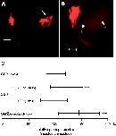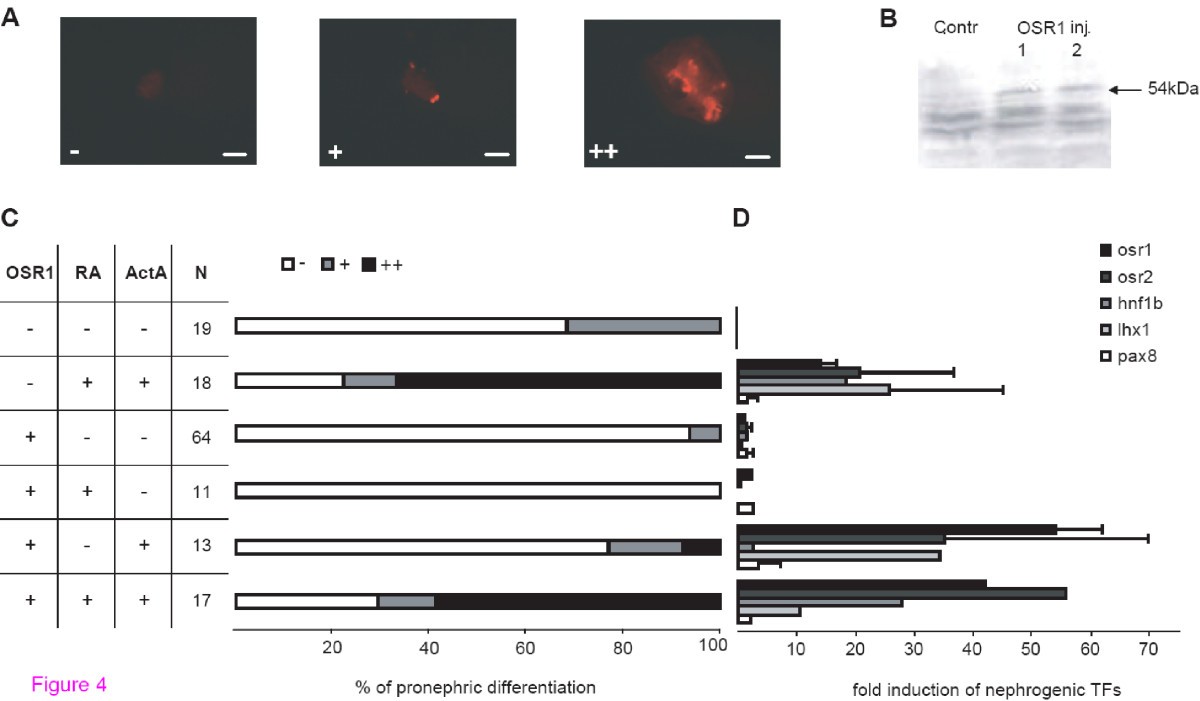 Figure 4. Expression of human OSR1 in animal caps. Animal caps derived from embryos injected with OSR1 mRNA were cultured in Steinberg's solution, retinoic acid (RA, 10-4M) and/or activin A (ActA, 10 ng/ml) as indicated. To avoid a too high lethality only 150 pg mRNA was injected. (A) Classification of whole-mount immunostained animal caps used for the analysis of pronephric tissue induction. The immunostaining was done with a mixture of the antibodies 3G8 and 4A6: - no pronephric tissue, + two or more pronephric cell patches or a small area of pronephric cells, +++ pronephric tubule like structures. Bar = 200 μm (B) Exogenous OSR1 is expressed in injected embryos. After cutting the animal caps protein extracts of the remaining late blastula stage embryos injected with OSR1 mRNA were used for Western blot analysis with myc-tag specific antibody. Lane 1 and 2 refer to two pools of ten embryos. The exogenous myc-OSR1 is marked by an arrow. (C) The pronephros induction potential in animal caps was assayed after four days using the categories given in panel A. N refers to the number of animal caps investigated. (D) Quantitative RT-PCR analysis for the expression of early nephrogenic transcription factors (TFs) of animal caps after three hours and treated as indicated in (C). The bar represents the values of two independent animal cap pools (N = 30) tested. The results of OSR1 injection with retinoic acid treatment alone or in combination with activin A are each from one animal cap pool. Data obtained for hnf1b expression were only from one pool tested except for OSR1 injection alone.