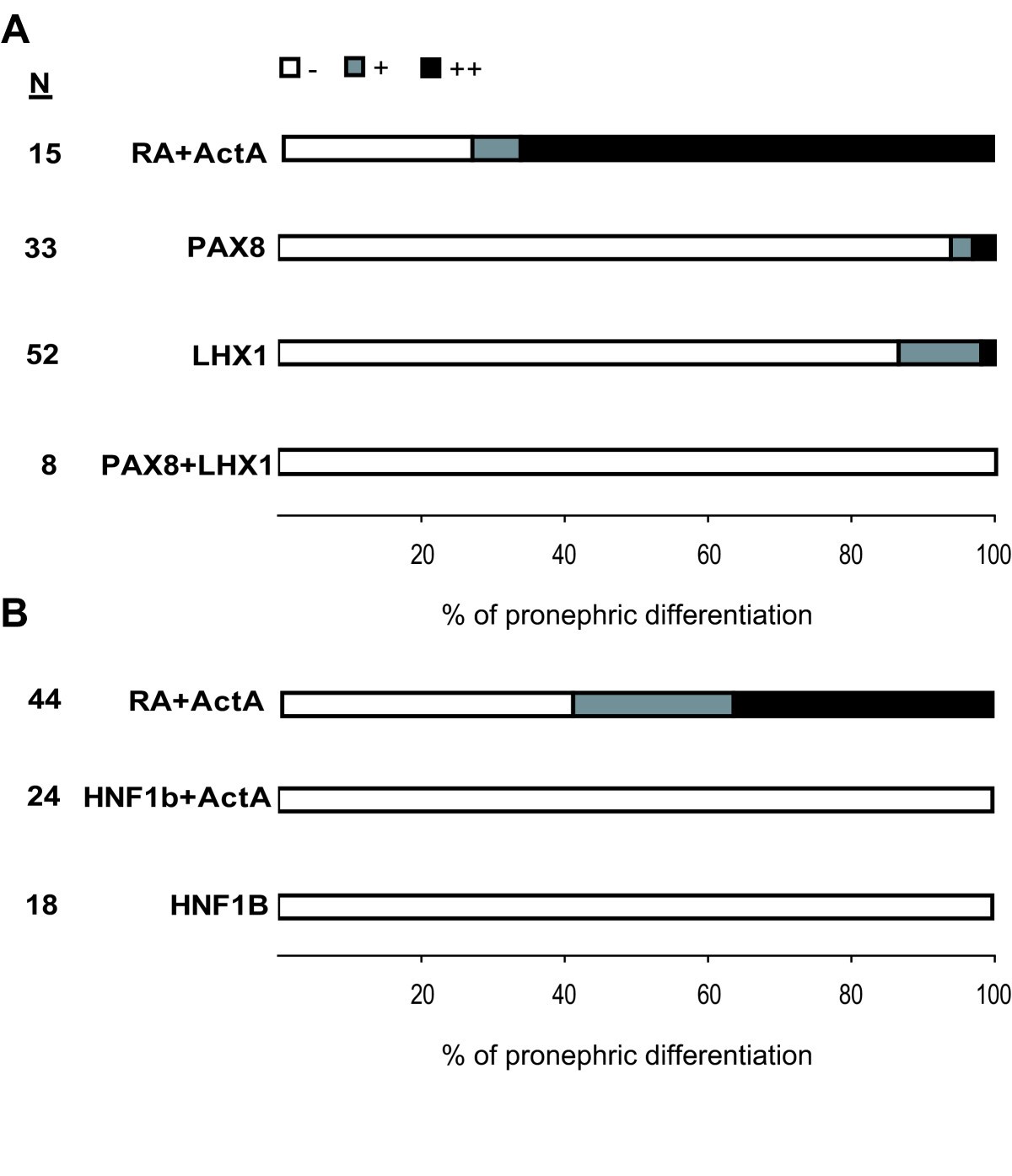 Figure 5. Expression of human LHX1, PAX8 and HNF1B in animal caps. Animal caps of LHX1 and/or PAX8 (250 pg alone or 125 pg each) or HNF1B (150 pg) injected embryos were cultured in Steinberg's solution for three hours and analysed after four days by whole-mount immunostaining using a mixture of the antibodies 3G8 and 4A6. Activin A (ActA, 10 ng/ml) and retinoic acid (RA, 10-4M) were added as given. (A) and (B) The pronephric tissue induction in animal caps treated as indicated on the left was scored using the categories given in Figure 4A. The number of animal caps (N) is given.