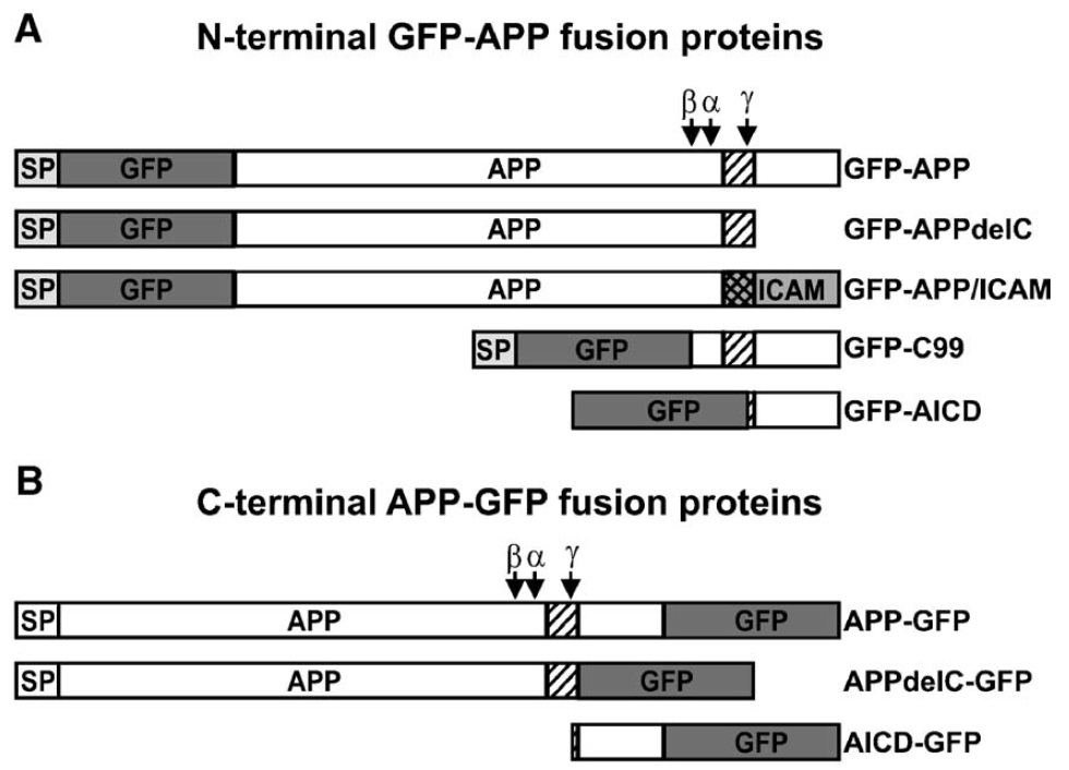 or C-terminal (B) GFP-fusion proteins of wild-type and mutant APP. Arrows indicate the β-, α- or γ-secretase processing sites