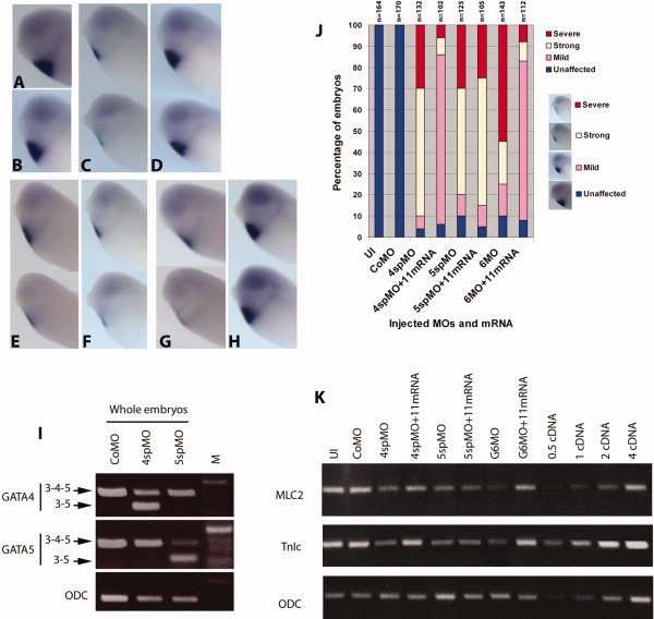 Figure 1. Wnt11b mediates the differential requirements for GATA4, 5, and 6 during cardiogenesis in vivo. AâH: In situ hybridization of TnIc in stage-32 embryos. Uninjected embryos (A) or embryos injected into prospective cardiac mesoderm with CoMO (B), GATA4 spMO alone (C), GATA4 spMO with Wnt11b mRNA (D), GATA5 spMO alone (E), GATA5 spMO with Wnt11b mRNA (F), GATA6 tlMO alone (G), and GATA6 tlMO with Wnt11b mRNA (H). I: RT-PCR analysis of endogenous GATA4 and 5 mRNAs on pools of embryos injected either with GATA4 or GATA5 spMOs. GATA4 and 5 spMOs cause splicing out of exon 4 in GATA4 and 5 mRNAs, respectively. 3-4-5, cDNA that contains exon 4 and parts of exons 3 and 5 (GATA4: 371bp, GATA5: 333bp); 3-5, cDNA without exon 4 (GATA4: 273bp, GATA5: 204bp). J: Bar charts showing percentage of embryos with severely, strongly, and mildly reduced or unaffected expression of TnIc in the experiment shown in AâH. K: Semi-quantitative RT-PCR analysis of gene expression of two cardiac differentiation markers MLC2 and TnIc at stage 32 on pools of embryos derived from embryos injected as those shown in AâH. The cardiac phenotype in the GATA morphants is analyzed by in situ hybridization of TnIc (C, E, and G) or RT-PCR of MLC2 and TnIc (K). Note that Wnt11b mRNA rescues to a large extent loss of cardiogenesis caused by GATA4 and 6 MOs (D, H, and K) but not by GATA5 MO (F and K). ODC was used as control and the linearity of the PCR reaction was controlled with a dilution series of the control cDNA. UI, CoMO, 4spMO, 5spMO, G6MO, and 11mRNA indicate uninjected, control morpholino, GATA4 splice morpholino, GATA5 splice morpholino, GATA6 morpholino, and Wnt11b mRNA, respectively.