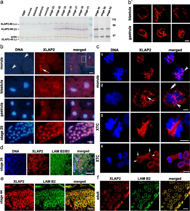 Laminin-associated polypeptide 2 (LAP2) proteins are alternatively spliced products of a single gene; they belong to the LEM domain family and, in mammals, locate to the nuclear envelope (NE) and nuclear lamina. Isoforms lacking the transmembrane domain also locate to the nucleoplasm. We used new specific antibodies against the N-terminal domain of Xenopus LAP2 to perform immunoprecipitation, identification and localization studies during Xenopus development. By immunoprecipitation and mass spectrometry (LC/MS/MS), we identified the embryonic isoform XLAP2γ, which was downregulated during development similarly to XLAP2ω. Embryonic isoforms XLAP2ω and XLAP2γ were located in close association with chromatin up to the blastula stage. Later in development, both embryonic isoforms and the adult isoform XLAP2β were localized in a similar way at the NE. All isoforms colocalized with lamin B2/B3 during development, whereas XLAP2β was colocalized with lamin B2 and apparently with the F/G repeat nucleoporins throughout the cell cycle in adult tissues and culture cells. XLAP2β was localized in clusters on chromatin, both at the NE and inside the nucleus. Embryonic isoforms were also localized in clusters at the NE of oocytes. Our results suggest that XLAP2 isoforms participate in the maintenance and anchoring of chromatin domains to the NE and in the formation of lamin B microdomains.