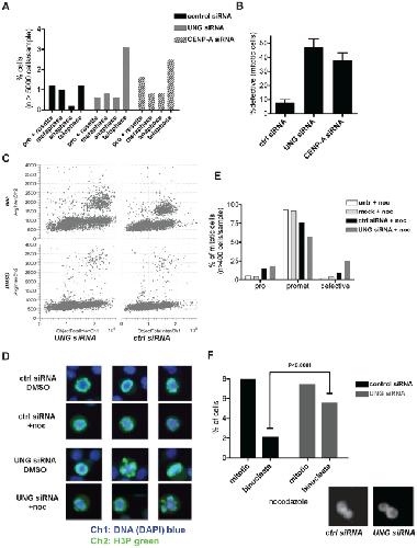 Figure 5. Pleiotropic effects of UNG-directed siRNA on cell division.A. Manual quantitation of H2B-YFP HeLa cells in each stage of mitosis 24 hours after transfection with control siRNA (black bars), UNG-directed (gray bars) siRNA, or CENP-A-directed siRNA (striped bars). B. Relative quantitation of defective mitotic HeLa cells after transfection with control siRNA, UNG-directed siRNA, or CENP-A-directed siRNA. C. High-throughput ( cells per sample) cell cycle analysis was performed using automated quantitative imaging with DAPI to detect DNA content (Total Intensity Ch1, x-axis) and H3P to detect G2 and mitotic cells (Average Intensity Ch2, y-axis). HeLa cells were treated with nocodazole to trigger a mitotic spindle checkpoint arrest, or DMSO solvent alone (bottom row), with or without siRNA transfection with UNG-directed siRNA (left column) or control siRNA (right column). D. Example images from analysis shown in parts C, E and F. DNA was detected with DAPI (blue); Histone H3 phosphorylated on Serine 10, H3P (pseudocolored green), was used to detect cells in G2 (not shown) and mitosis. Defective cells were apparent in samples transfected with UNG-directed siRNA (example, third row, middle) and were more frequent in the presence of nocodazole (examples, bottom row, ends). E. Manual quantitation of HeLa cells after nocodazole treatment. Metaphase and anaphase cells were not seen with nocodazole treatment, consistent with the majority of cells arresting in prometaphase. Samples treated with transfection reagent alone (mock) were similar to untreated samples (untr). Samples transfected with UNG siRNA exhibited fewer cells in prometaphase, and 4-fold more defective mitotic figures than did samples transfected with control siRNA. (one-way ANOVA). F. Comparison of cells in mitosis or binucleated after nocodazole treatment, with and without siRNA transfection with control (black bars) or UNG-directed (gray bars) siRNA. (unpaired t-test). |