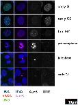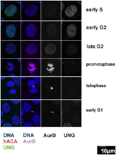 Figure 7. Cell cycle staging of UNG2 localization during G2 using indirect immunofluorescence.Example images from high-resolution confocal imaging using four channels. Left column, DNA was detected with DAPI (blue), endogenous CENP-A with ACA (red), and endogenous UNG2 with PU59 (green). Second column from the left, Aurora B was detected with Cy5 (pink) shown here with DNA (blue). Aurora B and UNG2 channels are shown alone in grayscale for clarity. Note the presence of Aurora B in the second row, indicating that UNG2 foci resembling centromeres are prominent during early G2. |