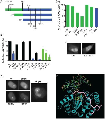 Figure 12. Requirements for UNG2 accumulation at sites of DNA damage.A. Schematic representation of truncations and point mutations tested in this study. B. Percent of cells with GFP-UNG2 foci at sites of laser-induced damage are shown, along with example images of the full-length catalytic site mutants. Full-length mutants (black bars) were all competent for accumulation, except for Y147A. 46 truncations (green bars) exhibited decreased focus formation. 94 truncations (blue bars) were consistently the least competent, particularly the D145N and N204D versions. C. Example images of full-length mutants shown in part C. D. Percent of cells with GFP-fusion foci at sites of laser-induced damage, using N-terminal peptides lacking the catalytic domain (example images in part E), or non-catalytic point mutations in full-length UNG2. E. Example images of two mutants shown in part D. F. Molecular dynamics model showing that the N-terminal residues of UNG2 (residues 65–85; pink), could potentially interact with the catalytic domain (structures 1AKZ, 1EMH, 1SSP, [27], near active site residue Y147 (pink). |