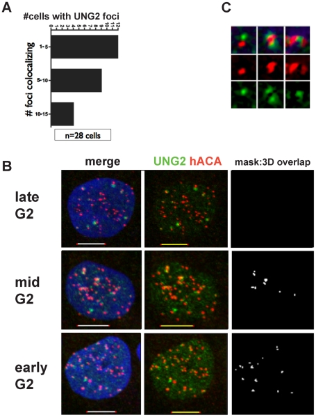 Figure 8. Transient UNG2 colocalization with centromeres correlates with the transition to double-dots.A. Binned categories of cells (n = 28 cells) with significant numbers of UNG2 foci colocalizing with centromeres. B. Example deconvolved high-resolution images of 143b cells in each bin. Colocalization of UNG2 detected with PU59 (green) with centromeres detected with ACA (red), shown with DNA (blue, left) or a mask of the measured 3-dimensional overlap above threshold (white, right). C. Examples of double-dots with UNG2 in green and ACA in red. |