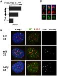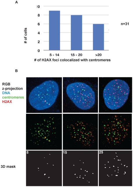 Figure 9. Quantitative analysis of phosphorylated H2AX signals colocalized with centromeres.A. Binned categories of cells (nâ=â31 cells) with significant numbers of phospho-H2AX foci colocalized with centromeres. B. Example deconvolved high-resolution images of 143b cells in each bin. Colocalization of centromeres detected with ACA (green), phospho-H2AX was detected with a monoclonal antibody (red), shown with DNA (blue, top row) or a mask of the measured 3-dimensional overlap above threshold (white, bottom row). |
