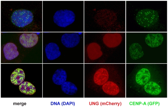Figure 11. Overexpressing UNG-mCherry is sufficient to rapidly induce excess accumulation of GFP-CENP-A.Example images of 143b cells transiently co-transfected with mCherry-UNG (red) and GFP-CENP-A (green), fixed and stained with DAPI to detect DNA (blue). In cells with no detectable UNG, GFP-CENP-A localized to centromeres (top row). In cells with low levels of mCherry-UNG, GFP-CENP-A was distributed throughout the nucleus (middle row). In cells with high levels of mCherry-UNG, GFP-CENP-A accumulated to extremely high levels (bottom row). |
