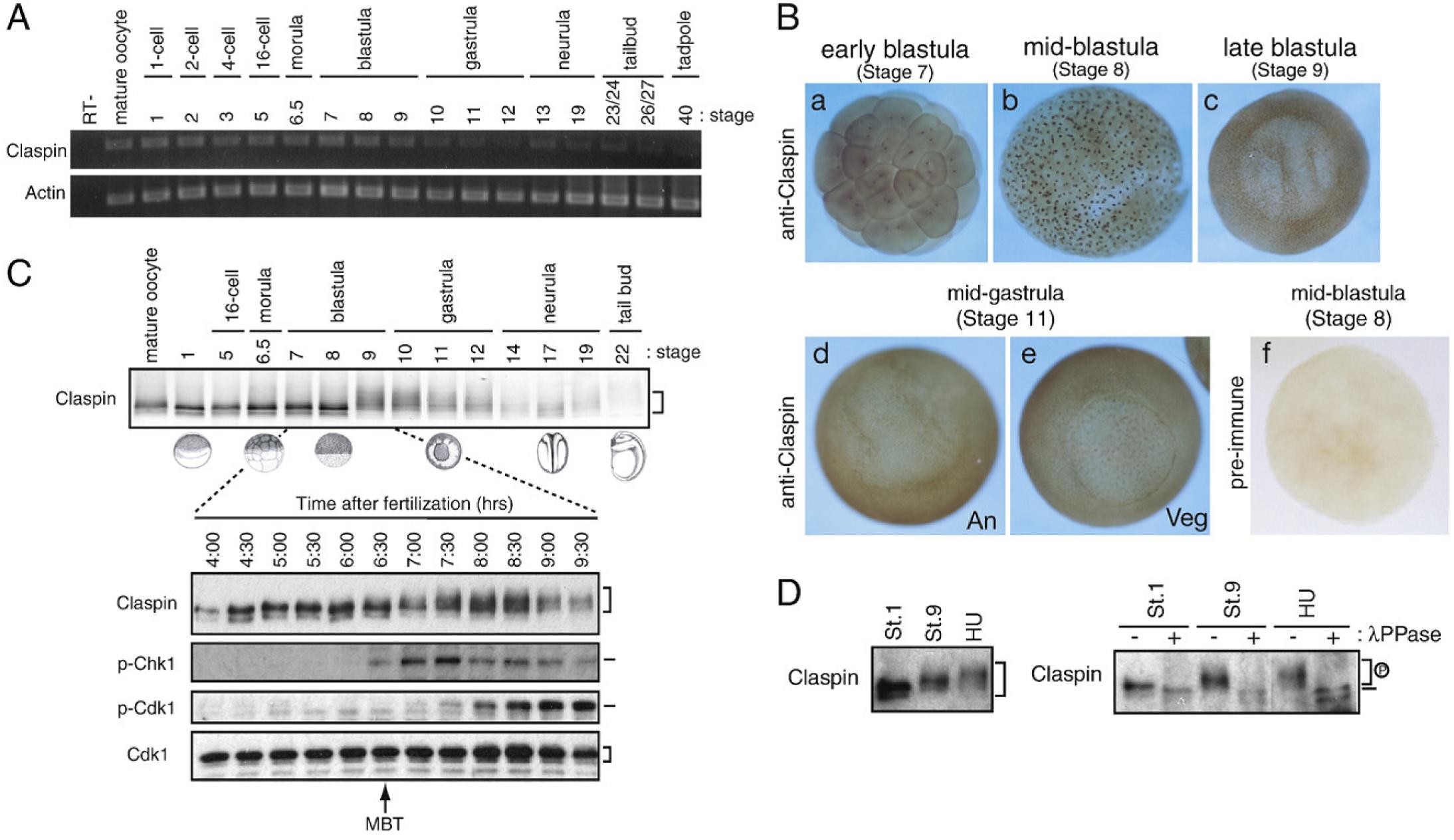 Fig. 1. Claspin is phosphorylated at theMBT. (A) Temporal expression of ClaspinmRNA. RT-PCRwas performed on RNA isolated frommature oocytes and stagedembryos (Nieuwkoop and Faber, 1956) using primers specific for Claspin and actin as a control. (B) Spatial expression of Claspin protein. Whole-mount immunohistochemistry was performed with embryos at indicated stages using anti-Claspin serum(a) and preimmune serumas a control (f).An and Veg denote a viewfromanimal and vegetal poles, respectively.Unlabeled views are from the animal pole. (C) Temporal expression of Claspin protein. Western blotting with anti-Claspin, anti-phospho Chk1, anti-Cdk1 or anti-phospho Cdk1 (Y15) antibodies was performed on extracts from mature oocytes and staged embryos (first row), or in amore detailed time course, fromearly blastula (stage 7) to early gastrula (stage 10) embryos at indicated times after fertilization (second through fifth rows). Proteins equivalent to those fromhalf an embryo were analyzed. (D) Fertilized eggs (stage 1) and late blastula embryos (stage 9) were collected. Someembryoswere treatedwith hydroxyurea (HU) fromthe 2-cell stage andwere collected at the late blastula stage. The embryo extractswere subject to immunoprecipitationwith an anti-Claspin antiserum. Immunoprecipitates were treated without (â) or with (+) lambda phosphatase. Embryo extracts (left panel) and immunoprecipitates (right panel) were subjected toWestern blotting with an anti-Claspin antibody. -=unphosphorylated Claspin, and P=phosphorylated Claspin.